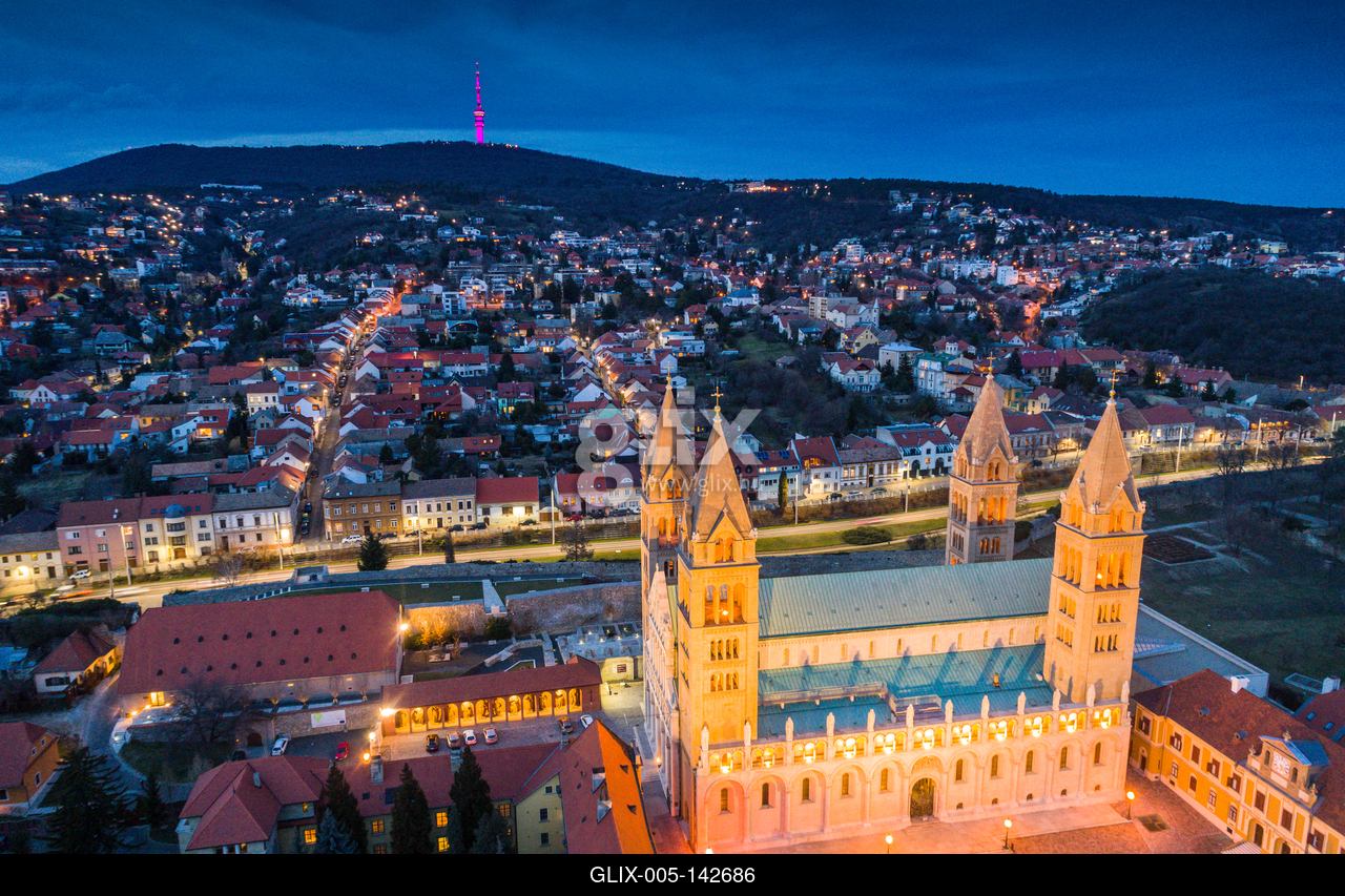Pecs, Szekesegyhaz. Bird eye view at nightPécs belvárosa a Pécsi Székesegyházzal, alkonyati díszkivilágításban. Máttérben a Mecsek csúcsai, a Misina-tető a TV toronnyal.A pécsi Szent Péter- és Szent Pál-székesegyház (pécsi dóm, bazilika vagy vártemplom) a Pécsi egyházmegye katedrálisa, a város egyik jellegzetes épülete.
