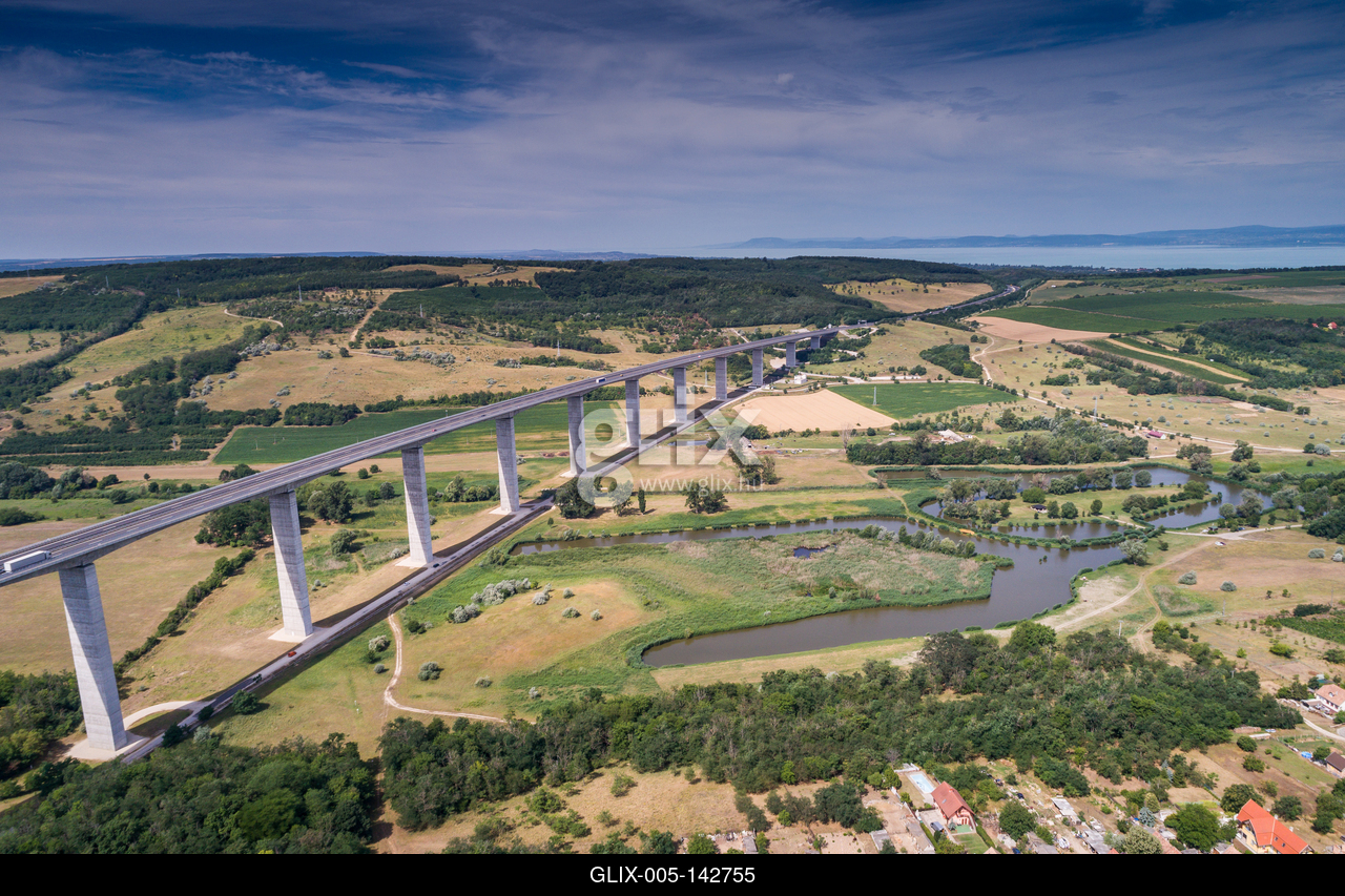 Viaduct of Koroshegy in Hungary. A Kőröshegyi völgyhíd viadukt az M7-es autópályán, Magyarország leghosszabb hídja. A Balaton déli partjával párhuzamosan, a Somogy megyei Zamárdi és Balatonszárszó között fut, Kőröshegy déli szomszédságában.