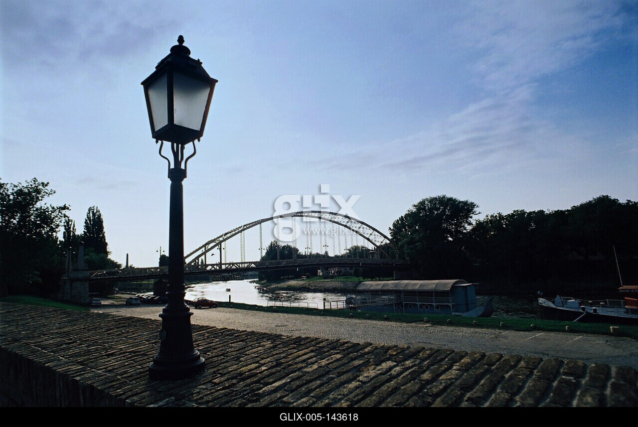 Fontos közlekedési csomópont, kulturális és közigazgatási központ a három folyó - a Duna, a Rába és a Rábca - találkozásánál fekvő, műemlékekben, látnivalókban gazdag megyeszékhely, Győr.Képünkön a Duna part és híd Győr belvárosában