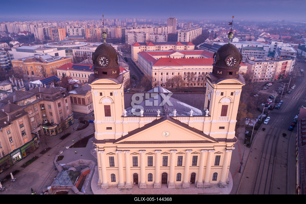Aerial photo of Reformed Great Church in Debrecen city, Hungary.A debreceni református nagytemplom Debrecen legjellegzetesebb épülete, 1500 m²-es alapterületével az ország legnagyobb református temploma, ezenkívül a legnagyobb protestáns templom is az országban. A Magyarországi Református Egyház jelképe, miatta nevezik Debrecent gyakran „kálvinista Rómának”. 1805 és 1824 között épült, klasszicista stílusban, a Kossuth tér és a Kálvin tér közt áll, a belvárosban.