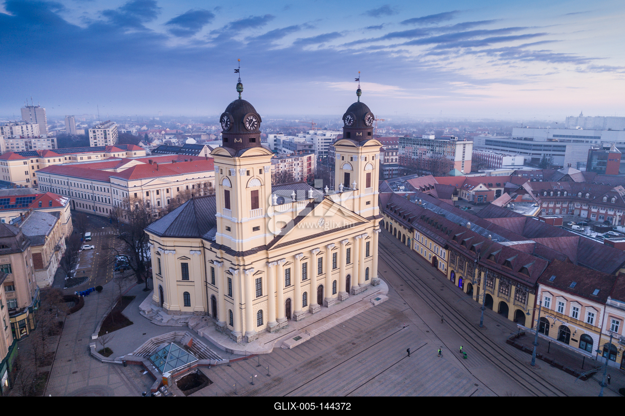 Aerial photo of Reformed Great Church in Debrecen city, Hungary.A debreceni református nagytemplom Debrecen legjellegzetesebb épülete, 1500 m²-es alapterületével az ország legnagyobb református temploma, ezenkívül a legnagyobb protestáns templom is az országban. A Magyarországi Református Egyház jelképe, miatta nevezik Debrecent gyakran „kálvinista Rómának”. 1805 és 1824 között épült, klasszicista stílusban, a Kossuth tér és a Kálvin tér közt áll, a belvárosban.