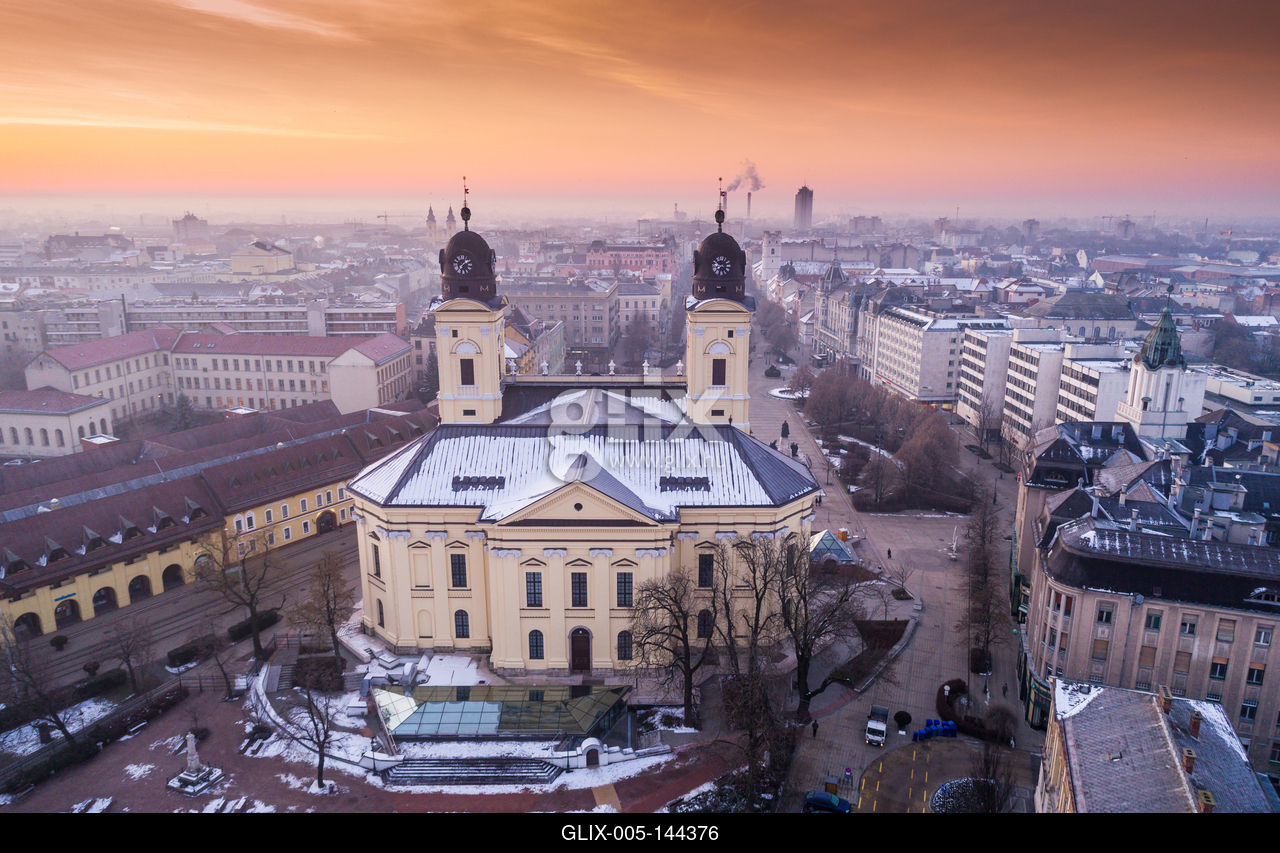 Aerial photo of Reformed Great Church in Debrecen city, Hungary.A debreceni református nagytemplom Debrecen legjellegzetesebb épülete, 1500 m²-es alapterületével az ország legnagyobb református temploma, ezenkívül a legnagyobb protestáns templom is az országban. A Magyarországi Református Egyház jelképe, miatta nevezik Debrecent gyakran „kálvinista Rómának”. 1805 és 1824 között épült, klasszicista stílusban, a Kossuth tér és a Kálvin tér közt áll, a belvárosban.