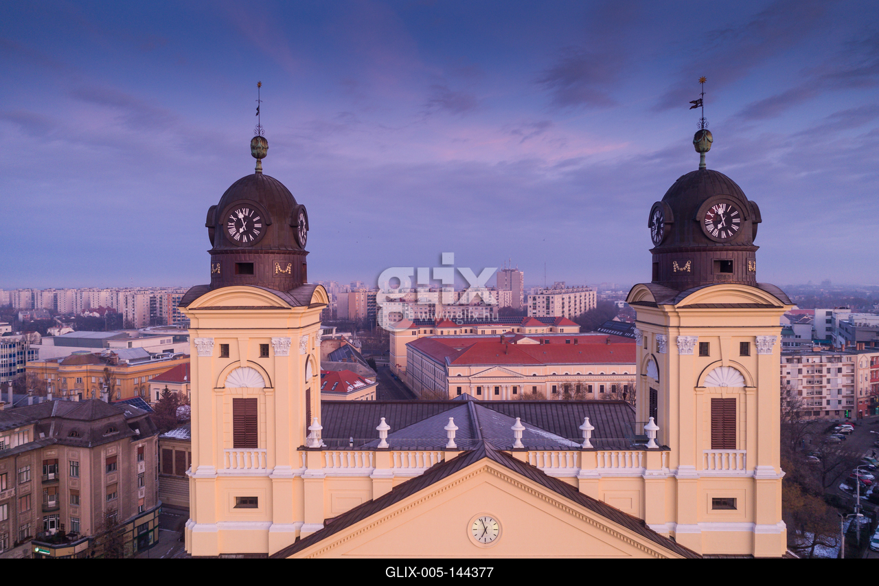 Aerial photo of Reformed Great Church in Debrecen city, Hungary.A debreceni református nagytemplom Debrecen legjellegzetesebb épülete, 1500 m²-es alapterületével az ország legnagyobb református temploma, ezenkívül a legnagyobb protestáns templom is az országban. A Magyarországi Református Egyház jelképe, miatta nevezik Debrecent gyakran „kálvinista Rómának”. 1805 és 1824 között épült, klasszicista stílusban, a Kossuth tér és a Kálvin tér közt áll, a belvárosban.