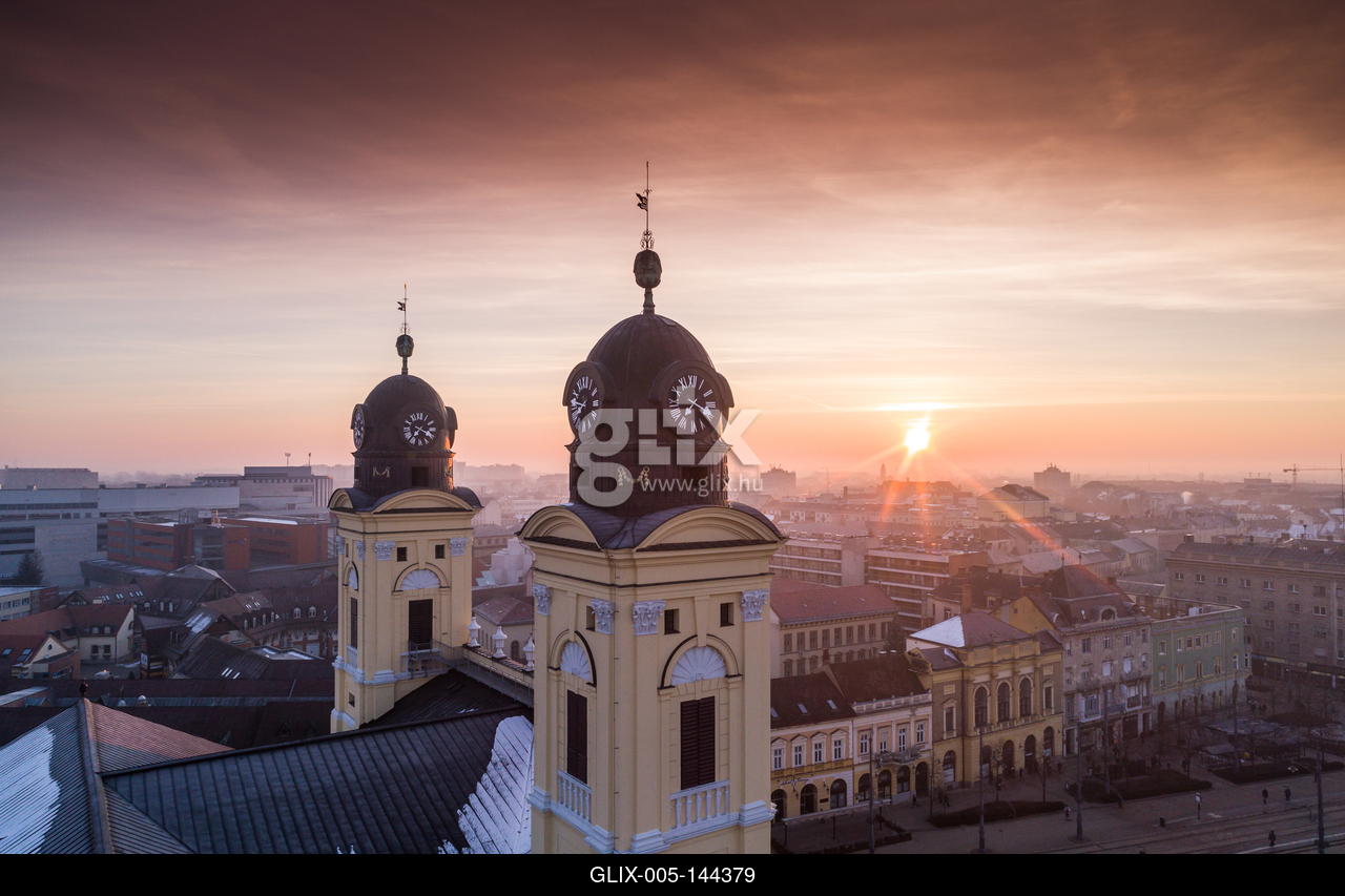 Aerial photo of Reformed Great Church in Debrecen city, Hungary.A debreceni református nagytemplom Debrecen legjellegzetesebb épülete, 1500 m²-es alapterületével az ország legnagyobb református temploma, ezenkívül a legnagyobb protestáns templom is az országban. A Magyarországi Református Egyház jelképe, miatta nevezik Debrecent gyakran „kálvinista Rómának”. 1805 és 1824 között épült, klasszicista stílusban, a Kossuth tér és a Kálvin tér közt áll, a belvárosban.