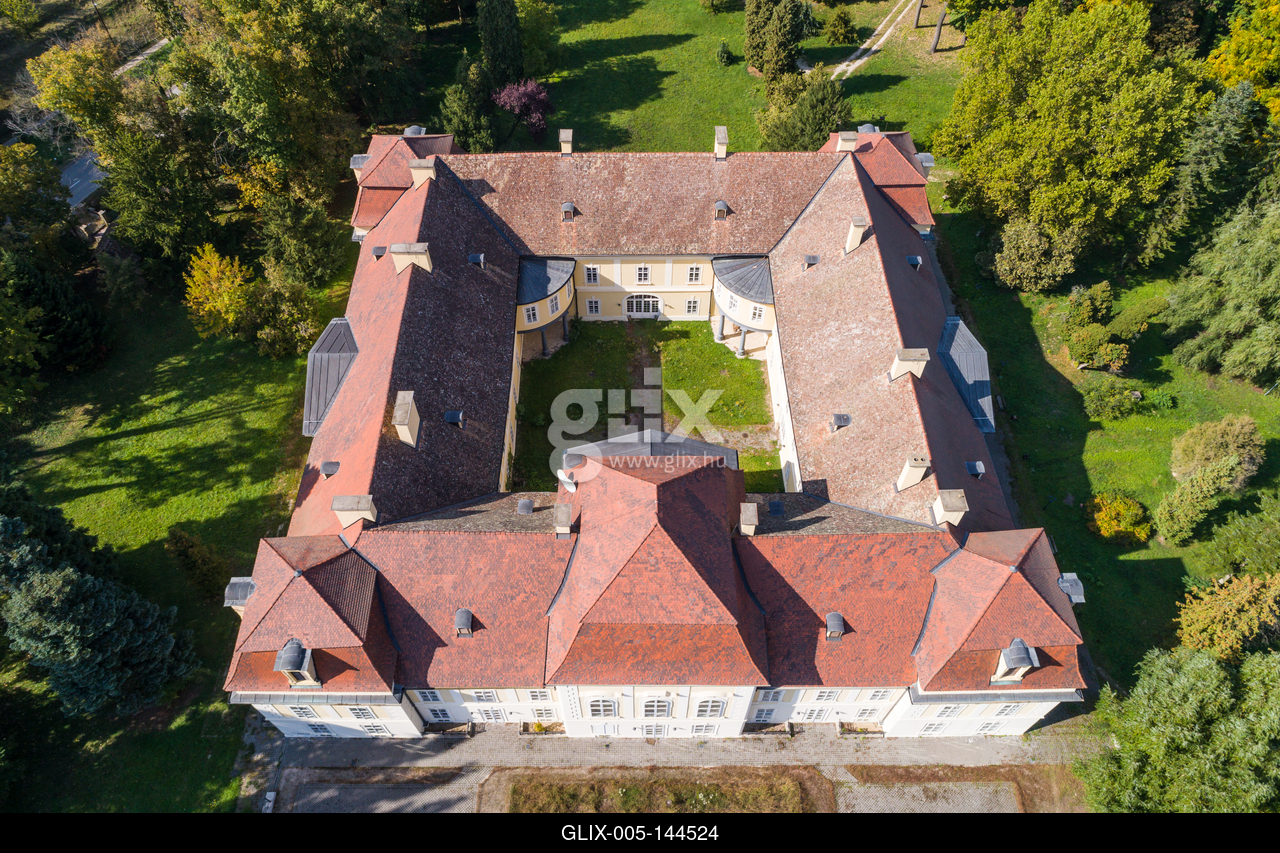 Aerial photo of Apponyi Castle, Hogyesz, Hungary. Az Apponyi-kastély vagy Apponyi-Liechtenstein kastély vagy Mercy–Apponyi-kastély Hőgyészen, Tolna megyében található. A barokk stílusú épületben ma kastélyszállóként funkcionál.