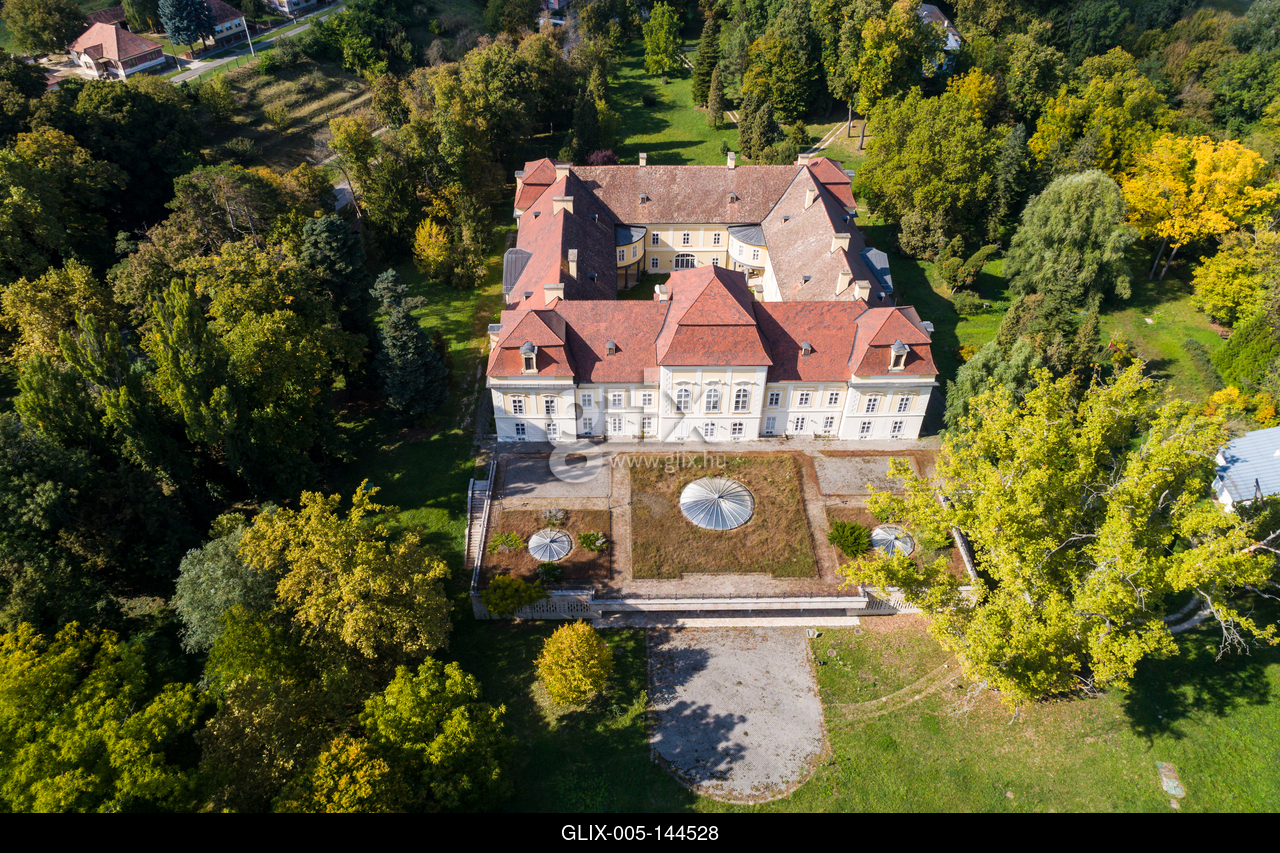 Aerial photo of Apponyi Castle, Hogyesz, Hungary. Az Apponyi-kastély vagy Apponyi-Liechtenstein kastély vagy Mercy–Apponyi-kastély Hőgyészen, Tolna megyében található. A barokk stílusú épületben ma kastélyszállóként funkcionál.