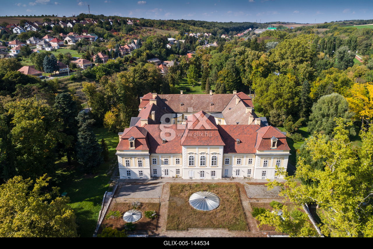Aerial photo of Apponyi Castle, Hogyesz, Hungary. Az Apponyi-kastély vagy Apponyi-Liechtenstein kastély vagy Mercy–Apponyi-kastély Hőgyészen, Tolna megyében található. A barokk stílusú épületben ma kastélyszállóként funkcionál.
