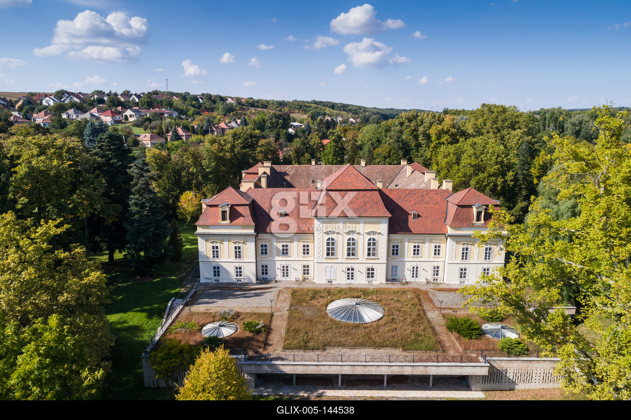 Aerial photo of Apponyi Castle, Hogyesz, Hungary. Az Apponyi-kastély vagy Apponyi-Liechtenstein kastély vagy Mercy–Apponyi-kastély Hőgyészen, Tolna megyében található. A barokk stílusú épületben ma kastélyszállóként funkcionál.