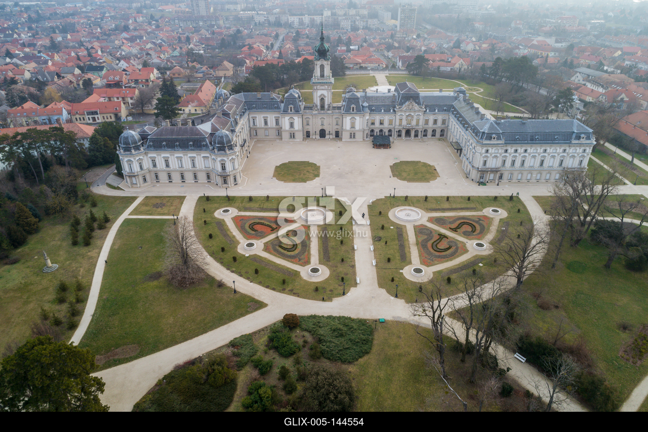 Aerial phooto of Festetics Castle in Keszthely, Hungary.A kastély és környéke madártávlatból. A Festetics-kastély Keszthely kiemelkedő jelentőségű műemléke. Építése még a 18. század közepén kezdődött el, ám csak az 1880-as években, nagyszabású átépítés és bővítés után nyerte el végleges formáját.