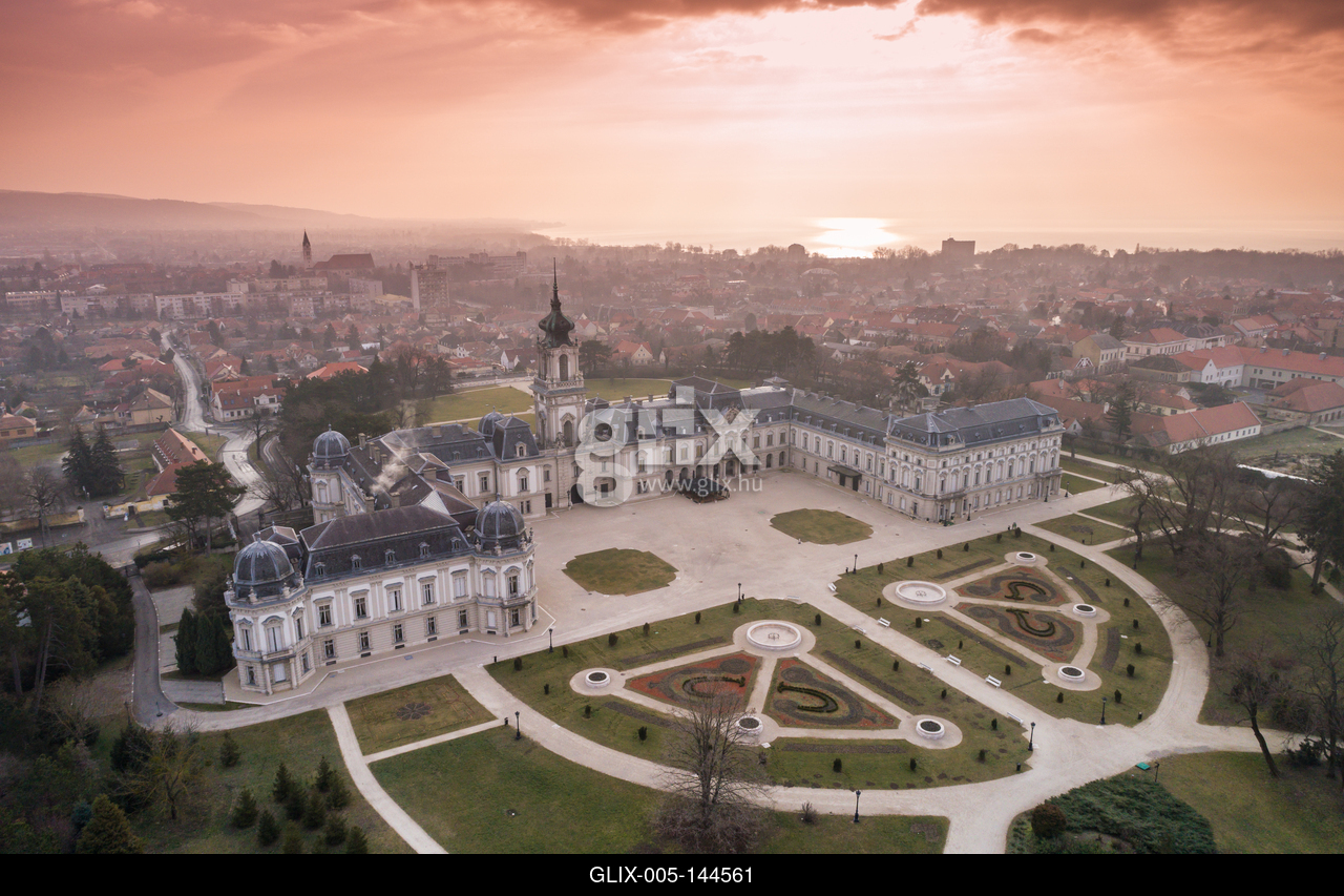 Aerial phooto of Festetics Castle in Keszthely, Hungary.A kastély és környéke madártávlatból. A Festetics-kastély Keszthely kiemelkedő jelentőségű műemléke. Építése még a 18. század közepén kezdődött el, ám csak az 1880-as években, nagyszabású átépítés és bővítés után nyerte el végleges formáját.