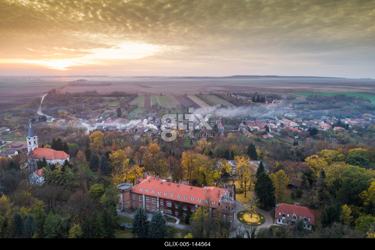 Benyovszky castle in Gorcsony, Hungary.A Baranya megyei Görcsöny és a Benyovszky kastély madártávlatból a kora reggeli órákban. A Benyovszky-kastély a kastélyparkkal a régi falu közepén áll; a Batthyány család építette a 18. században.