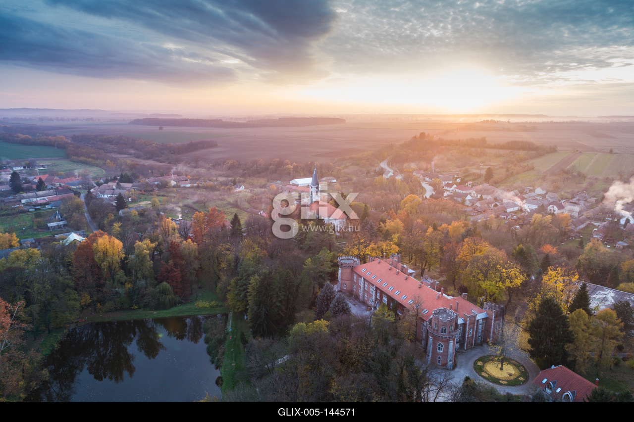 Benyovszky castle in Gorcsony, Hungary.A Baranya megyei Görcsöny és a Benyovszky kastély madártávlatból a kora reggeli órákban. A Benyovszky-kastély a kastélyparkkal a régi falu közepén áll; a Batthyány család építette a 18. században.