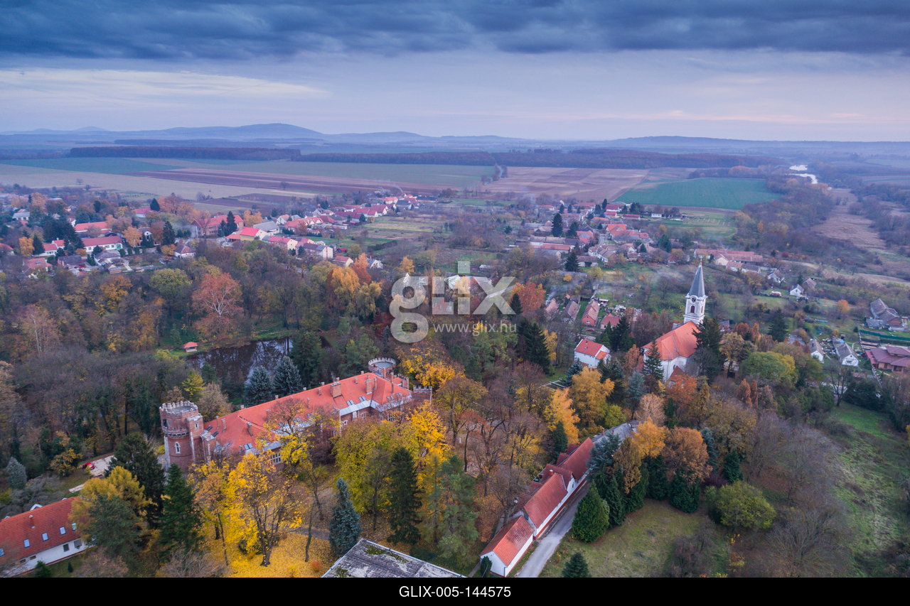 Benyovszky castle in Gorcsony, Hungary.A Baranya megyei Görcsöny és a Benyovszky kastély madártávlatból a kora reggeli órákban. A Benyovszky-kastély a kastélyparkkal a régi falu közepén áll; a Batthyány család építette a 18. században.