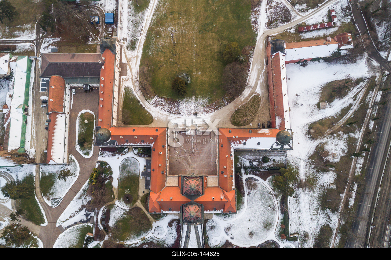 A gödöllői Grassalkovich-kastély télen, madártávlatból. A gödöllői Grassalkovich-kastély (vagy Gödöllői Királyi Kastély) a Grassalkovich családnak a város belterületén található kastélya. Ez Magyarország egyik legnagyobb barokk kastélya.Grassalkovich Royal castle in Godollo, Hungary