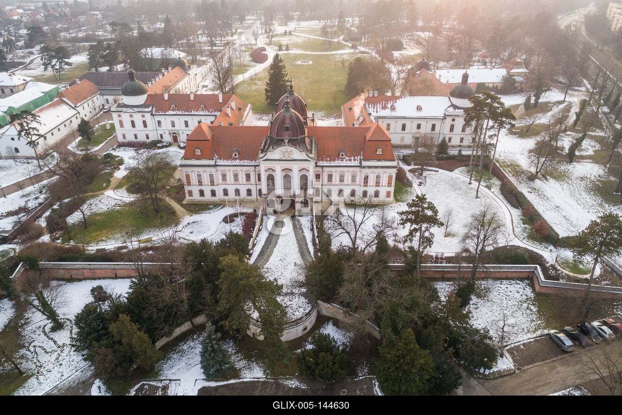 A gödöllői Grassalkovich-kastély télen, madártávlatból. A gödöllői Grassalkovich-kastély (vagy Gödöllői Királyi Kastély) a Grassalkovich családnak a város belterületén található kastélya. Ez Magyarország egyik legnagyobb barokk kastélya.Grassalkovich Royal castle in Godollo, Hungary