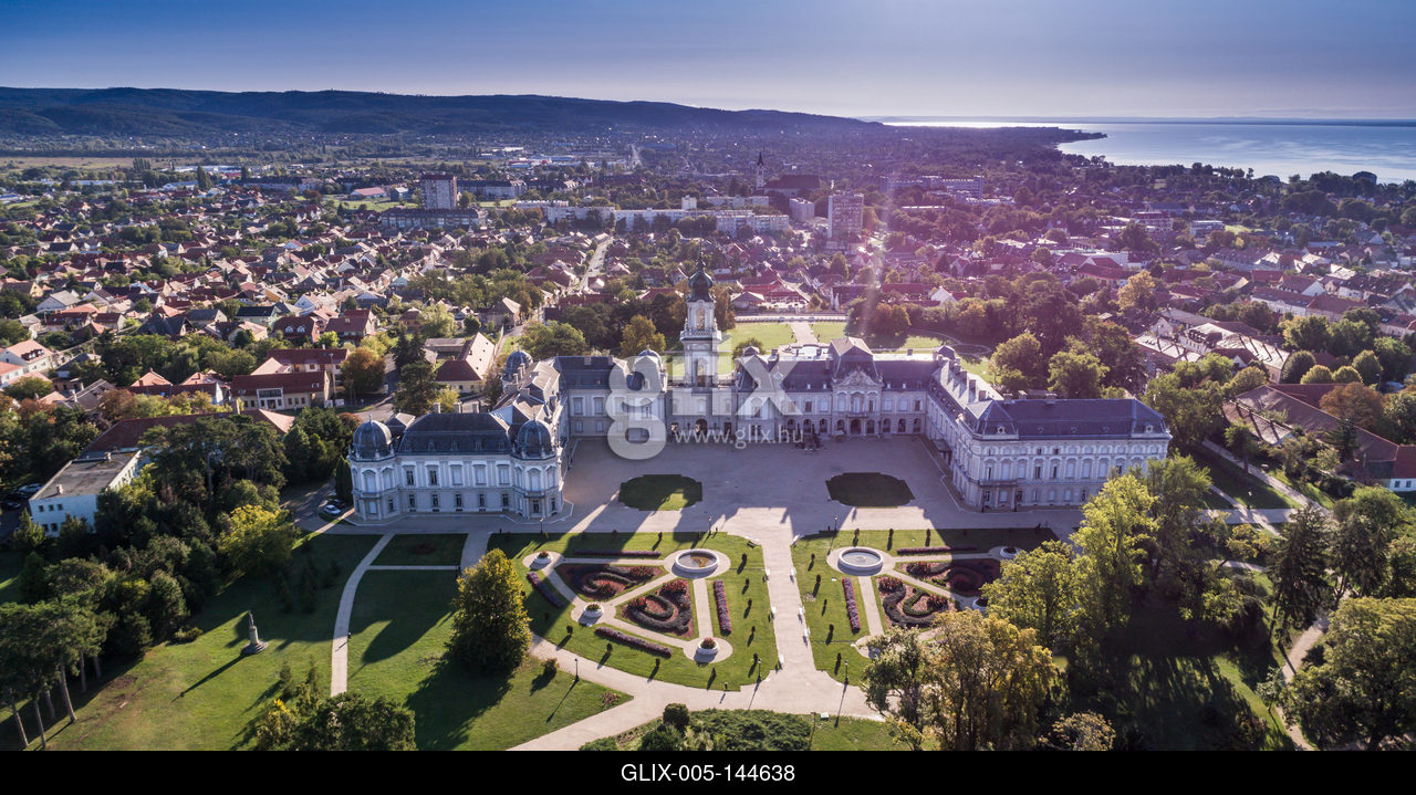 Aerial photo of Festetics Castle in Keszthely, Hungary.A kastély és környéke madártávlatból. A Festetics-kastély Keszthely kiemelkedő jelentőségű műemléke. Építése még a 18. század közepén kezdődött el, ám csak az 1880-as években, nagyszabású átépítés és bővítés után nyerte el végleges formáját.