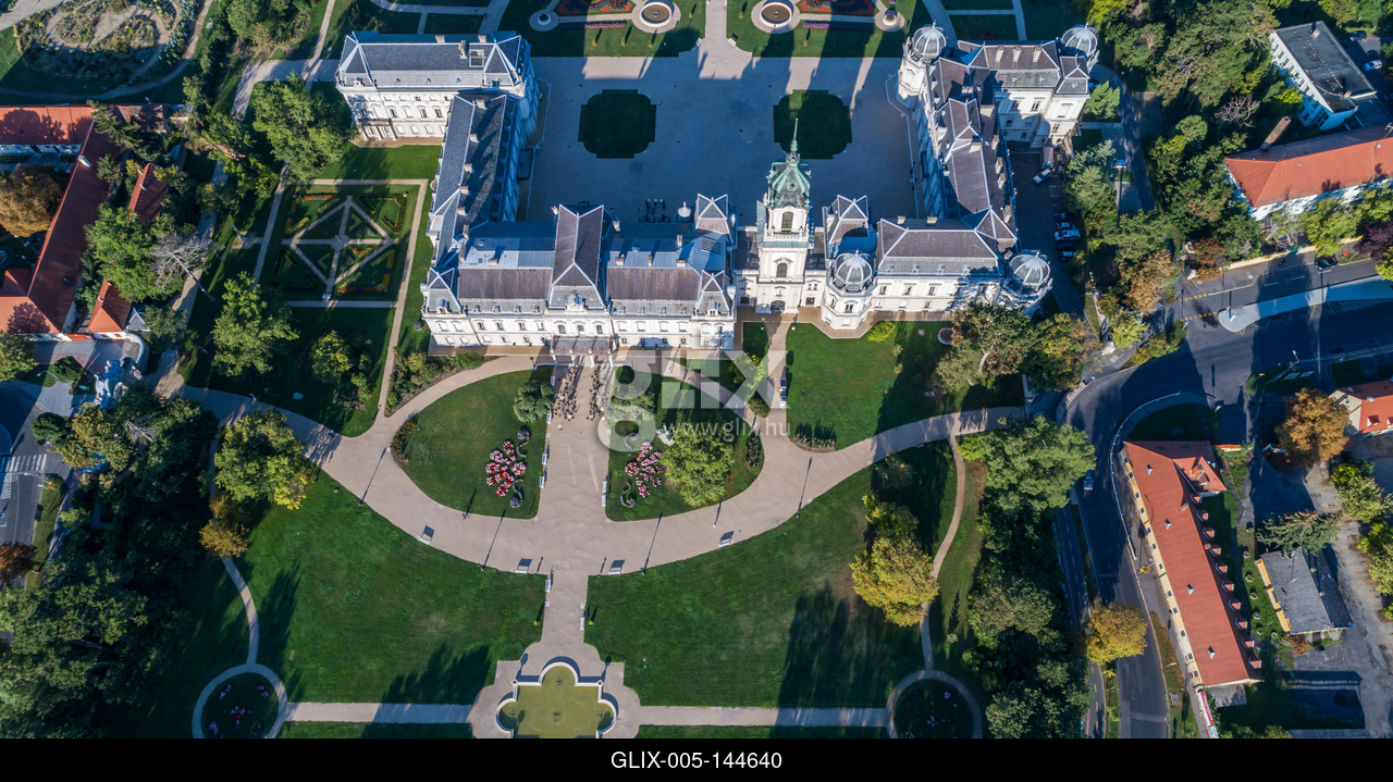 Aerial photo of Festetics Castle in Keszthely, Hungary.A kastély és környéke madártávlatból. A Festetics-kastély Keszthely kiemelkedő jelentőségű műemléke. Építése még a 18. század közepén kezdődött el, ám csak az 1880-as években, nagyszabású átépítés és bővítés után nyerte el végleges formáját.