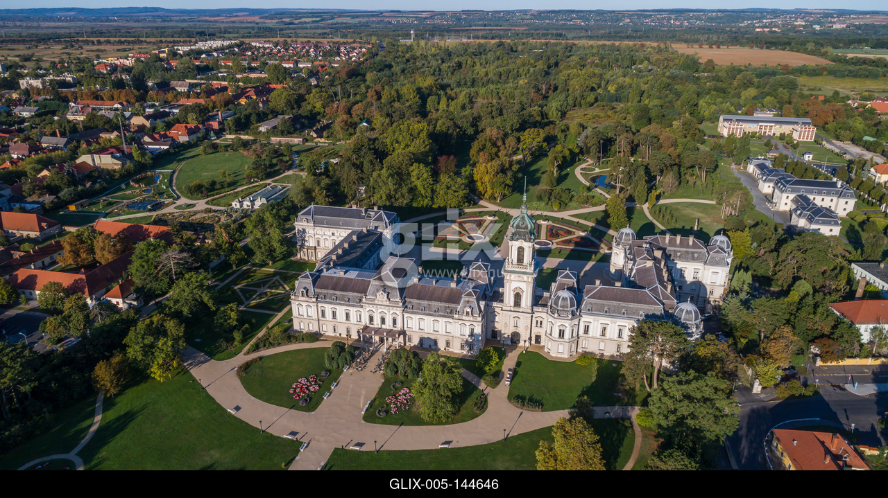 Aerial photo of Festetics Castle in Keszthely, Hungary.A kastély és környéke madártávlatból. A Festetics-kastély Keszthely kiemelkedő jelentőségű műemléke. Építése még a 18. század közepén kezdődött el, ám csak az 1880-as években, nagyszabású átépítés és bővítés után nyerte el végleges formáját.