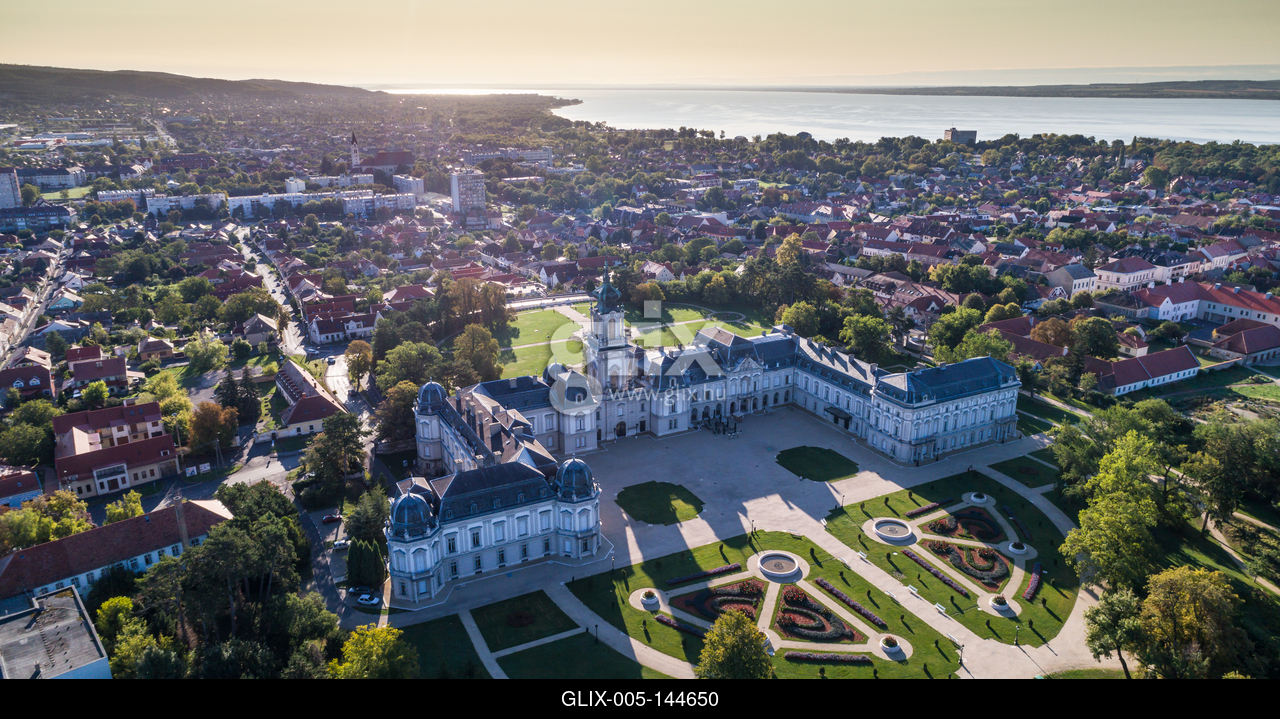 Aerial photo of Festetics Castle in Keszthely, Hungary.A kastély és környéke madártávlatból. A Festetics-kastély Keszthely kiemelkedő jelentőségű műemléke. Építése még a 18. század közepén kezdődött el, ám csak az 1880-as években, nagyszabású átépítés és bővítés után nyerte el végleges formáját.