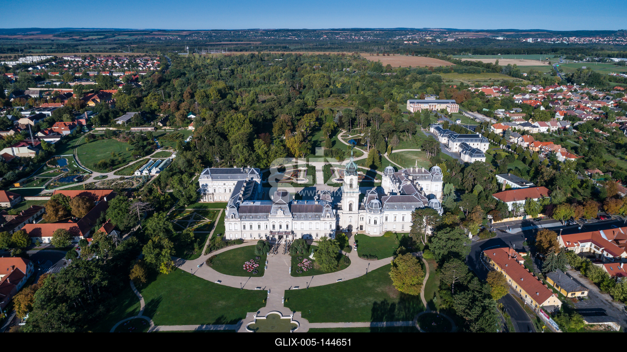 Aerial photo of Festetics Castle in Keszthely, Hungary.A kastély és környéke madártávlatból. A Festetics-kastély Keszthely kiemelkedő jelentőségű műemléke. Építése még a 18. század közepén kezdődött el, ám csak az 1880-as években, nagyszabású átépítés és bővítés után nyerte el végleges formáját.