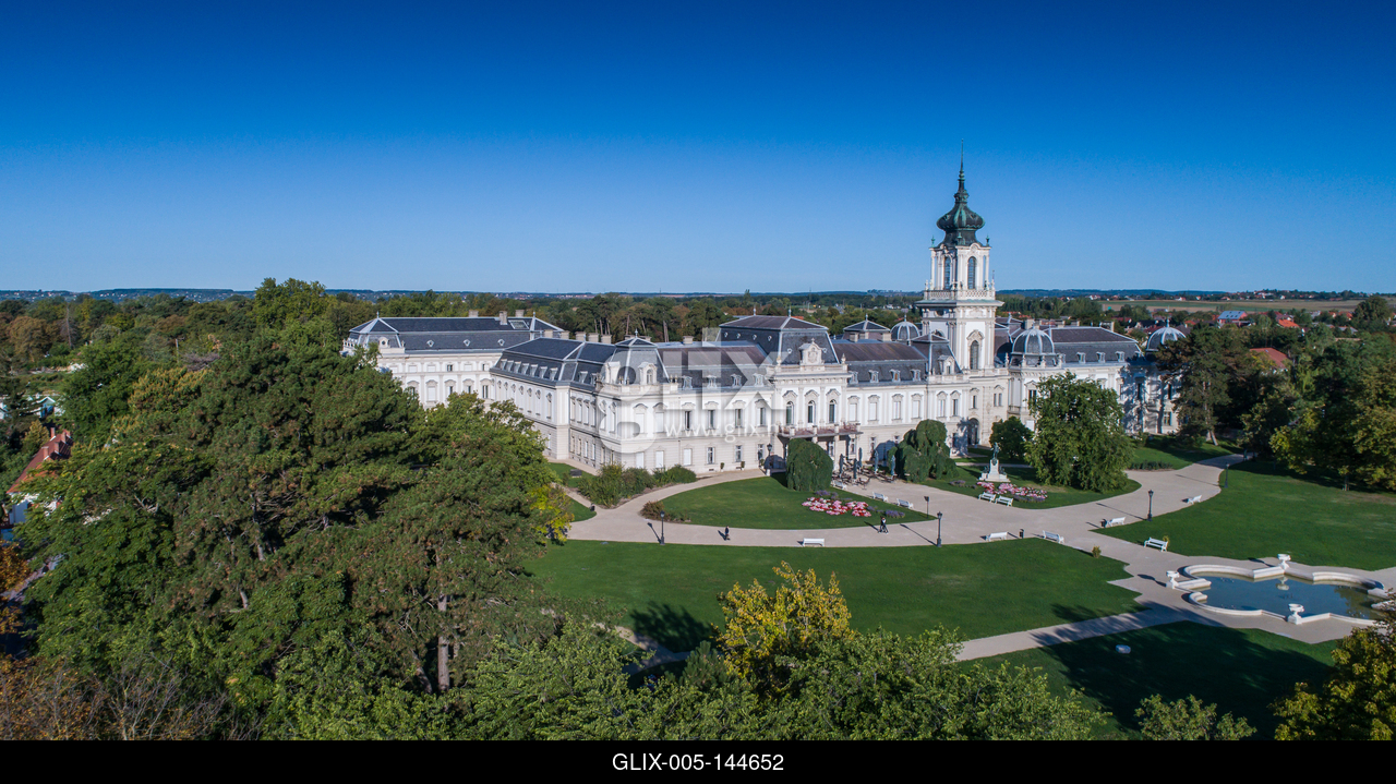 Aerial photo of Festetics Castle in Keszthely, Hungary.A kastély és környéke madártávlatból. A Festetics-kastély Keszthely kiemelkedő jelentőségű műemléke. Építése még a 18. század közepén kezdődött el, ám csak az 1880-as években, nagyszabású átépítés és bővítés után nyerte el végleges formáját.