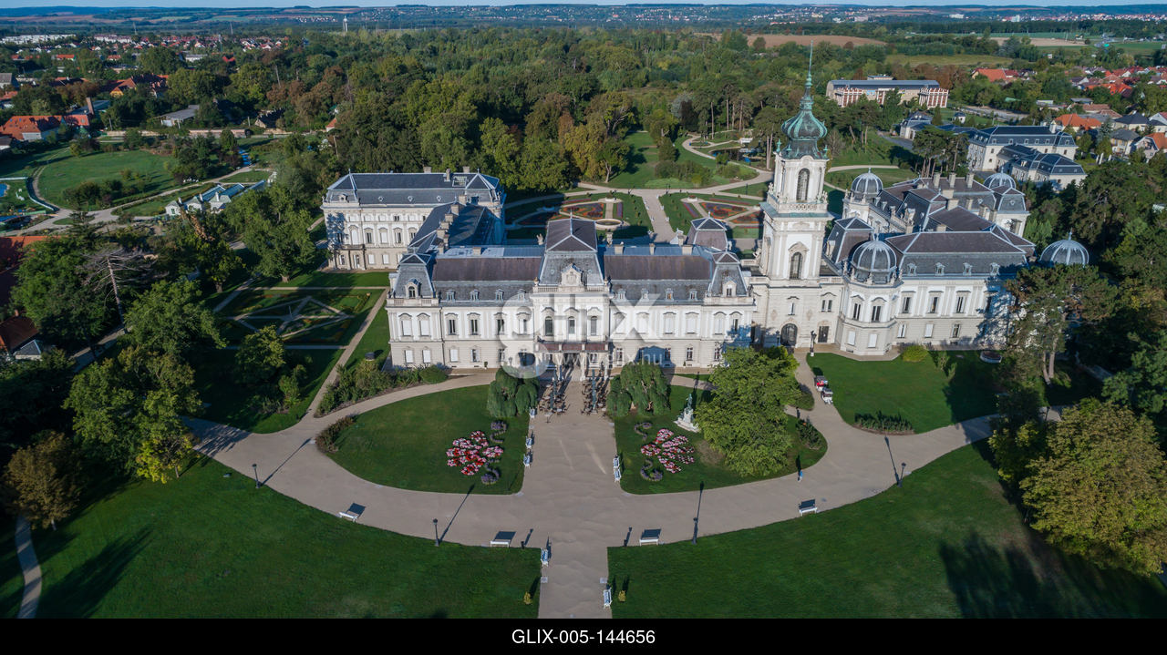 Aerial photo of Festetics Castle in Keszthely, Hungary.A kastély és környéke madártávlatból. A Festetics-kastély Keszthely kiemelkedő jelentőségű műemléke. Építése még a 18. század közepén kezdődött el, ám csak az 1880-as években, nagyszabású átépítés és bővítés után nyerte el végleges formáját.