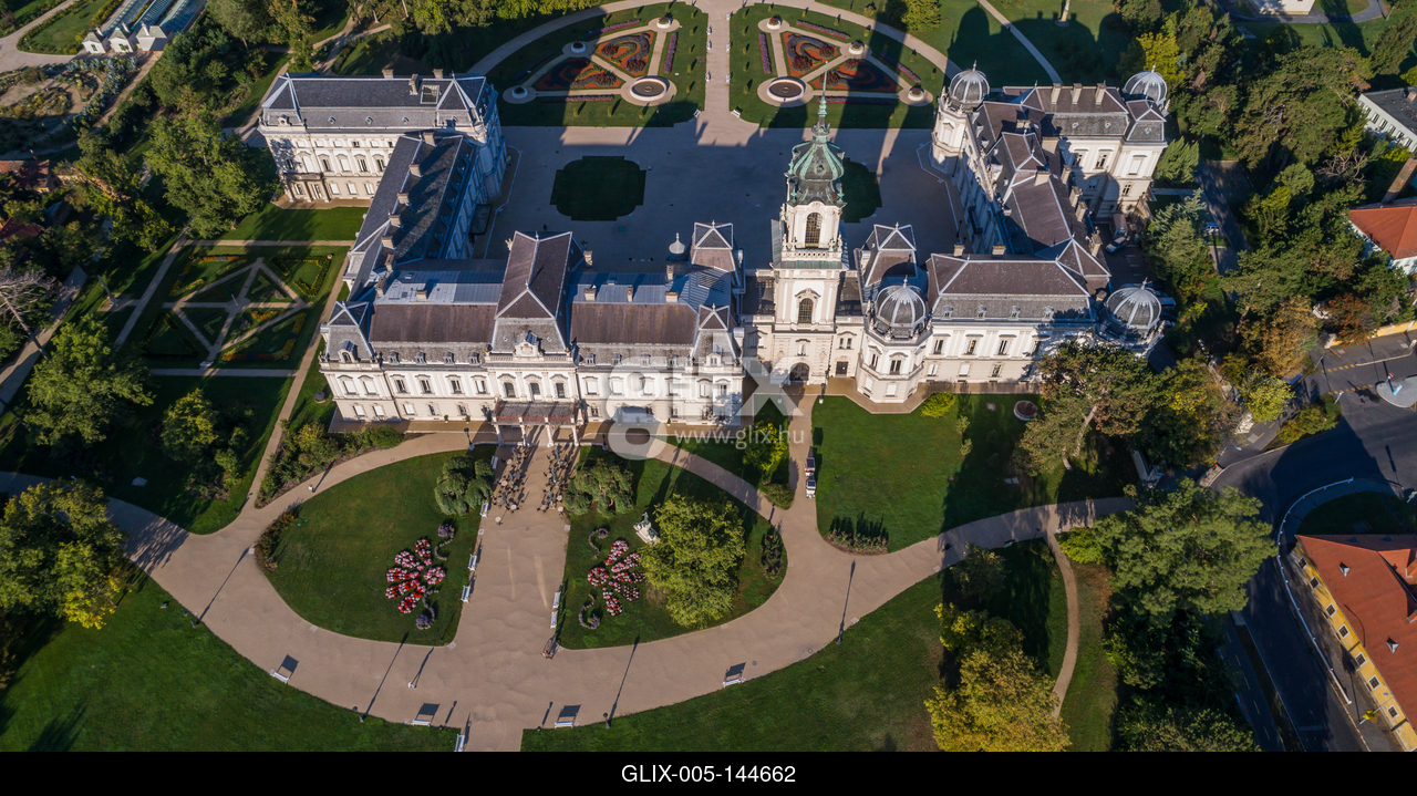 Aerial photo of Festetics Castle in Keszthely, Hungary.A kastély és környéke madártávlatból. A Festetics-kastély Keszthely kiemelkedő jelentőségű műemléke. Építése még a 18. század közepén kezdődött el, ám csak az 1880-as években, nagyszabású átépítés és bővítés után nyerte el végleges formáját.