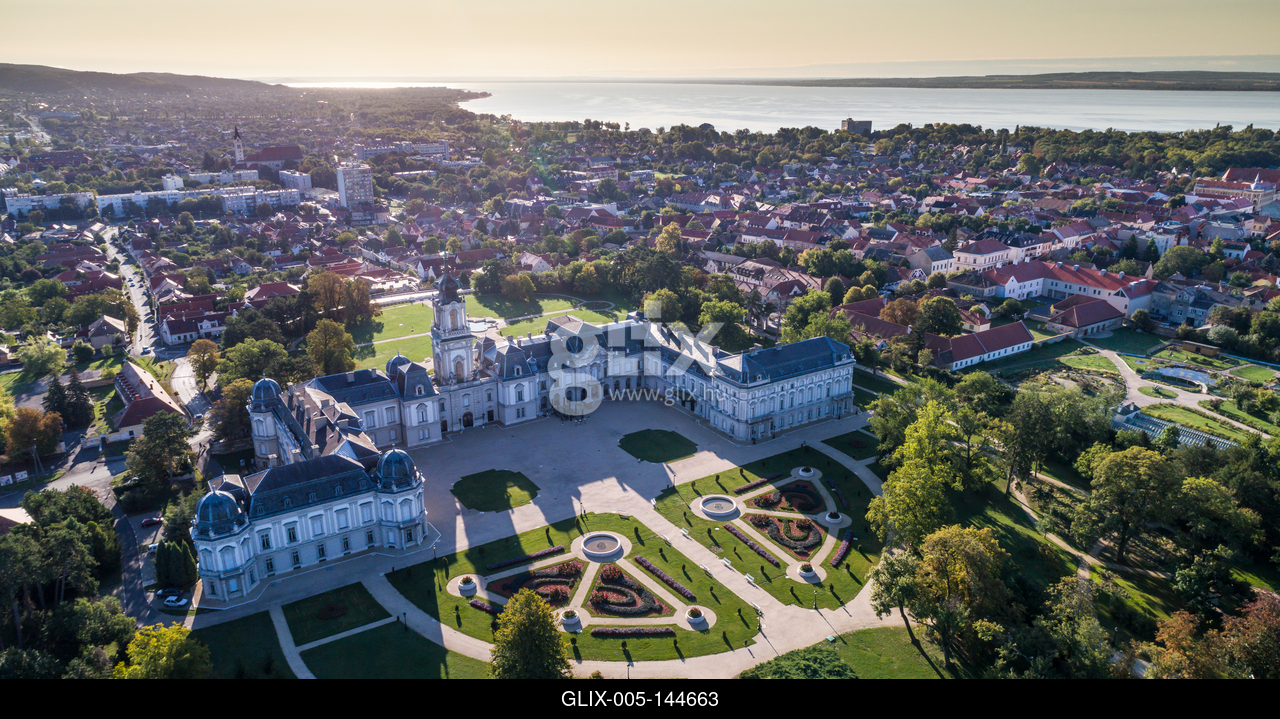 Aerial photo of Festetics Castle in Keszthely, Hungary.A kastély és környéke madártávlatból. A Festetics-kastély Keszthely kiemelkedő jelentőségű műemléke. Építése még a 18. század közepén kezdődött el, ám csak az 1880-as években, nagyszabású átépítés és bővítés után nyerte el végleges formáját.