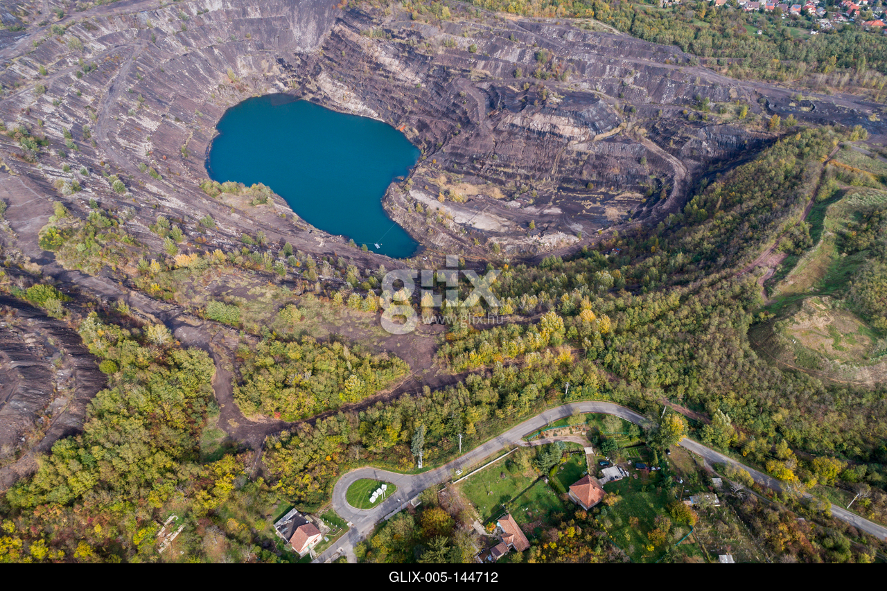 A Karolina-külfejtés és bányató látképe madártávlatból. A pécsbányai Karolina-külfejtésben 2004-ig folytattak bányászati tevékenységet.Aerial view, deep mine lake in place of a mining pit
