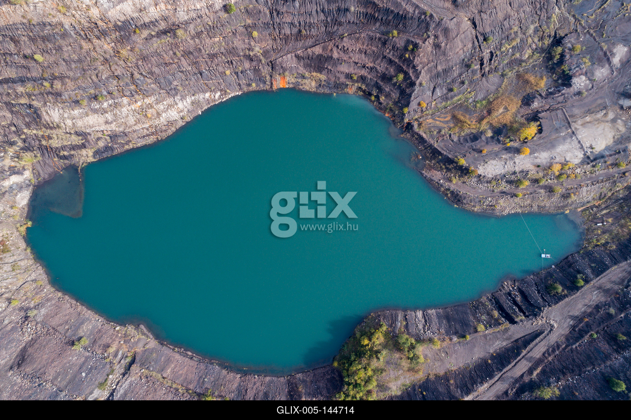 A Karolina-külfejtés és bányató látképe madártávlatból. A pécsbányai Karolina-külfejtésben 2004-ig folytattak bányászati tevékenységet.Aerial view, deep mine lake in place of a mining pit