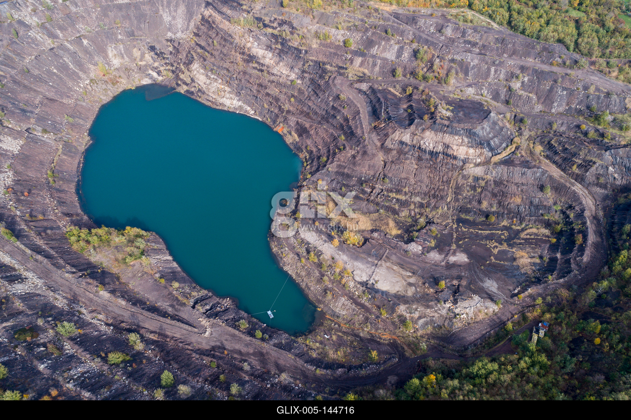 A Karolina-külfejtés és bányató látképe madártávlatból. A pécsbányai Karolina-külfejtésben 2004-ig folytattak bányászati tevékenységet.Aerial view, deep mine lake in place of a mining pit
