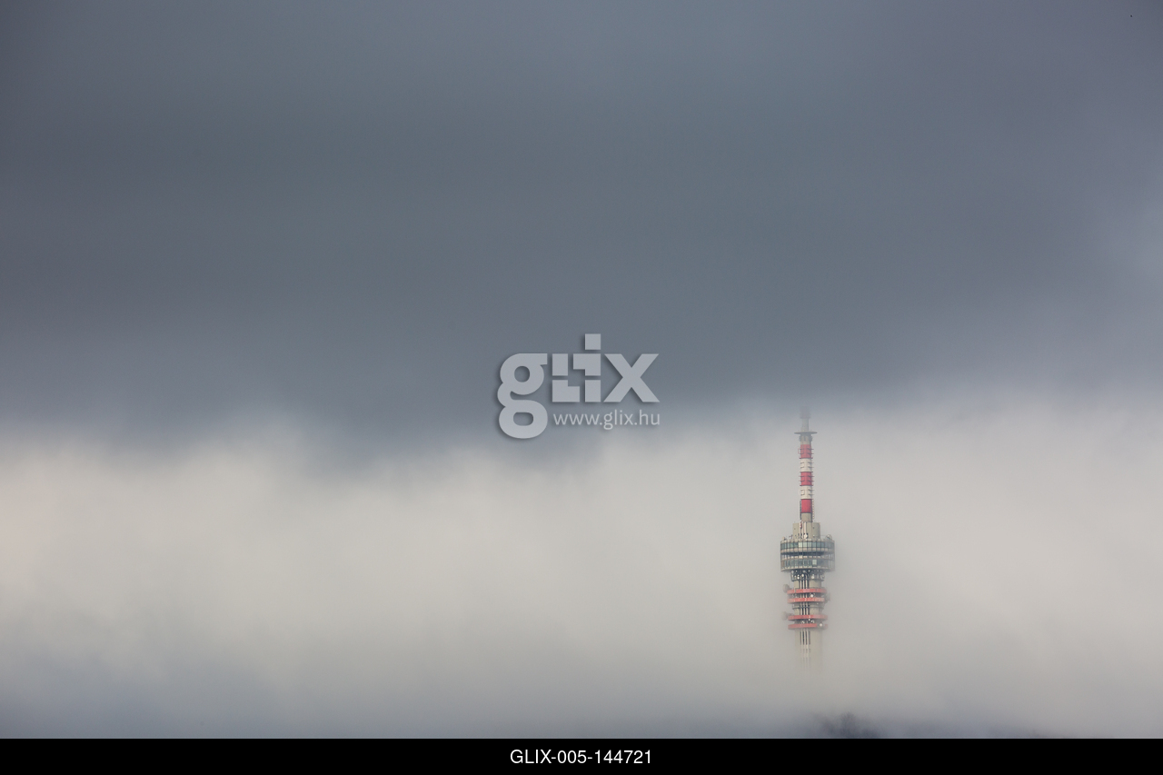 Telecommunication Tower in foggy and cloudy sky.A pécsi Tv-torony és Kilátó Magyarország legmagasabb épülete. A 197 méter magas épület a Mecsek 535 méter magas Misina csúcsán áll.