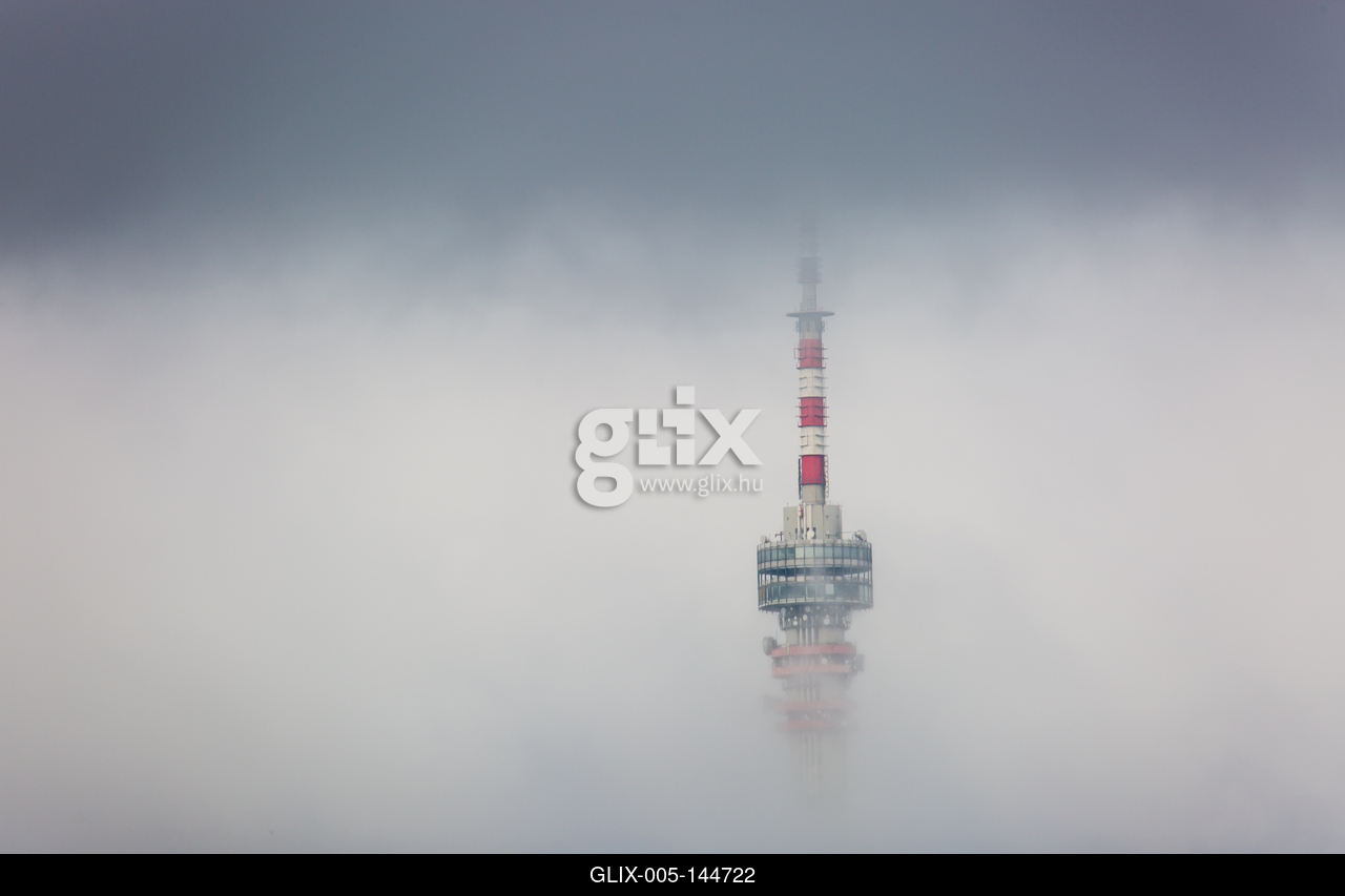 Telecommunication Tower in foggy and cloudy sky.A pécsi Tv-torony és Kilátó Magyarország legmagasabb épülete. A 197 méter magas épület a Mecsek 535 méter magas Misina csúcsán áll.