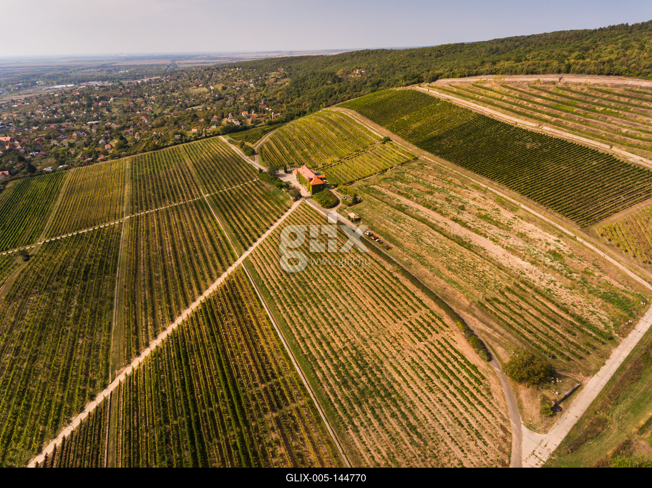 Vineyard from bird eye view with blue sky.A PTE Szőlészeti és Borászati Kutatóintézet Szentmiklóshegyi Kísérleti Telepe madártávlatból.A Pécsi borvidék egészen Mohácsig tart, a Mecsek déli lejtőin folyik szőlőművelés.