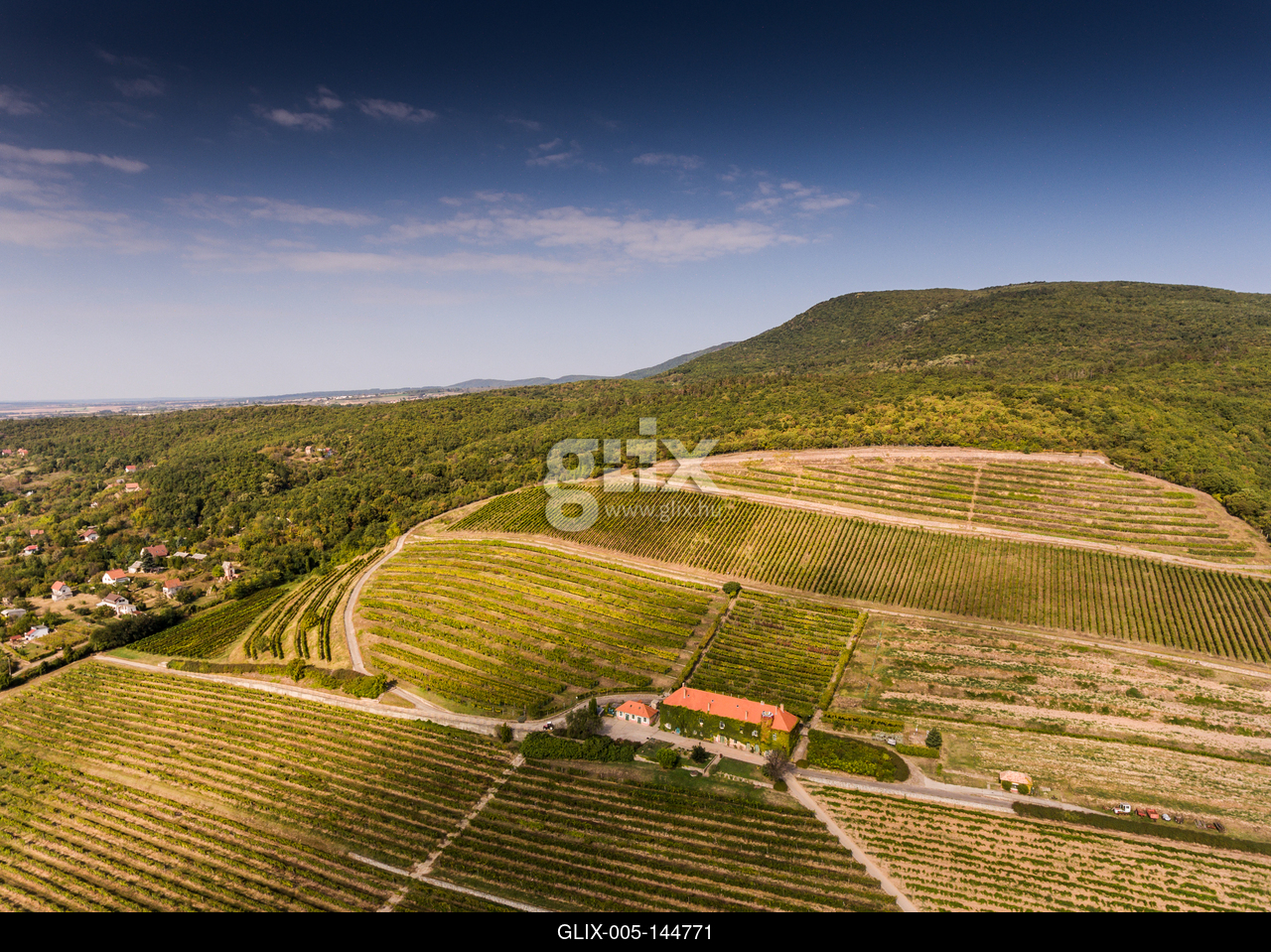 Vineyard from bird eye view with blue sky.A PTE Szőlészeti és Borászati Kutatóintézet Szentmiklóshegyi Kísérleti Telepe madártávlatból.A Pécsi borvidék egészen Mohácsig tart, a Mecsek déli lejtőin folyik szőlőművelés.