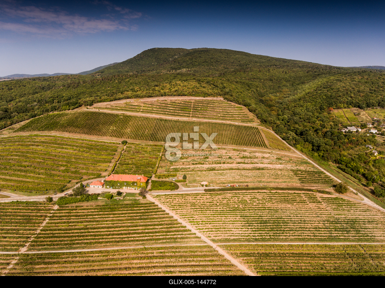 Vineyard from bird eye view with blue sky.A PTE Szőlészeti és Borászati Kutatóintézet Szentmiklóshegyi Kísérleti Telepe madártávlatból.A Pécsi borvidék egészen Mohácsig tart, a Mecsek déli lejtőin folyik szőlőművelés.