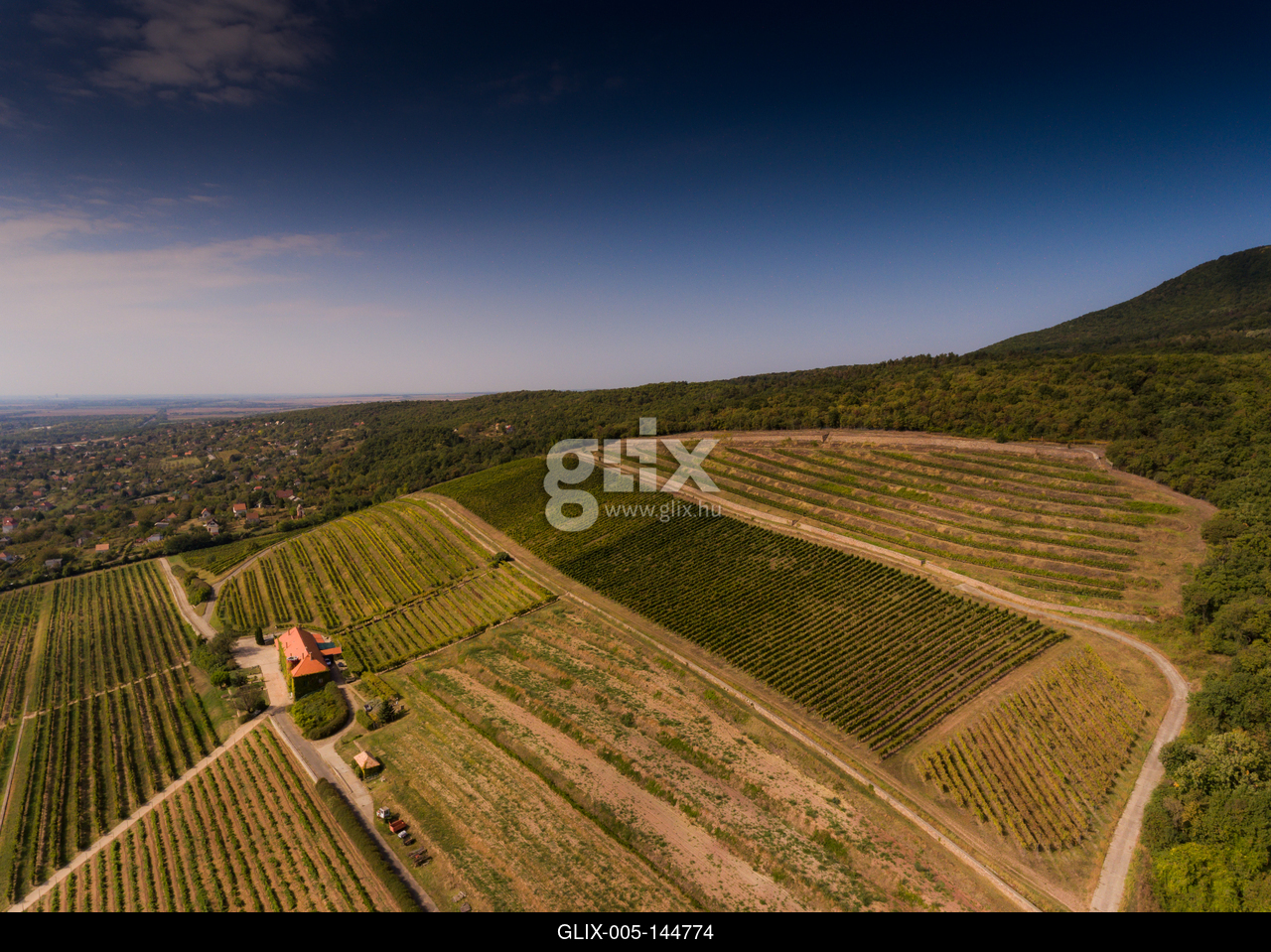 Vineyard from bird eye view with blue sky.A PTE Szőlészeti és Borászati Kutatóintézet Szentmiklóshegyi Kísérleti Telepe madártávlatból.A Pécsi borvidék egészen Mohácsig tart, a Mecsek déli lejtőin folyik szőlőművelés.