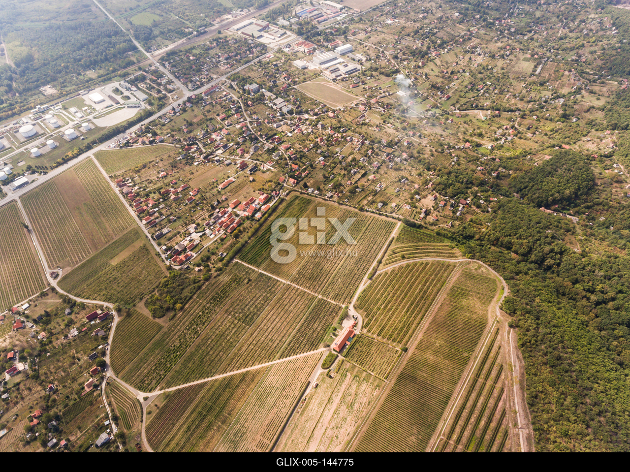 Vineyard from bird eye view with blue sky.A PTE Szőlészeti és Borászati Kutatóintézet Szentmiklóshegyi Kísérleti Telepe madártávlatból.A Pécsi borvidék egészen Mohácsig tart, a Mecsek déli lejtőin folyik szőlőművelés.