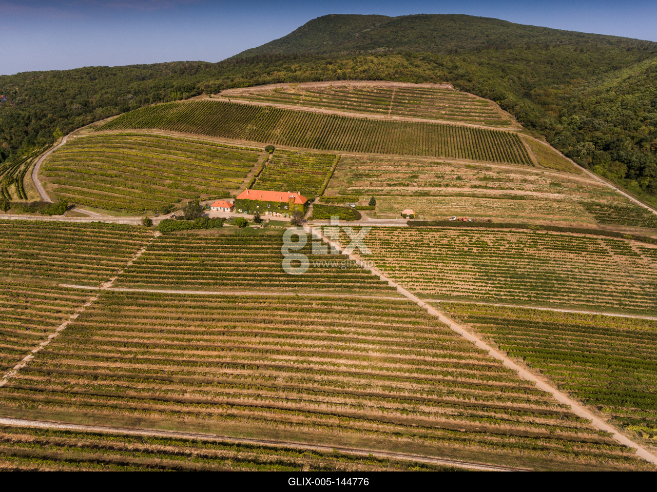 Vineyard from bird eye view with blue sky.A PTE Szőlészeti és Borászati Kutatóintézet Szentmiklóshegyi Kísérleti Telepe madártávlatból.A Pécsi borvidék egészen Mohácsig tart, a Mecsek déli lejtőin folyik szőlőművelés.
