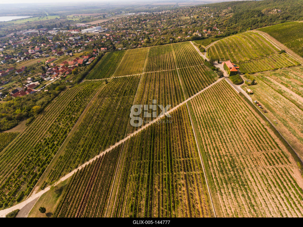 Vineyard from bird eye view with blue sky.A PTE Szőlészeti és Borászati Kutatóintézet Szentmiklóshegyi Kísérleti Telepe madártávlatból.A Pécsi borvidék egészen Mohácsig tart, a Mecsek déli lejtőin folyik szőlőművelés.