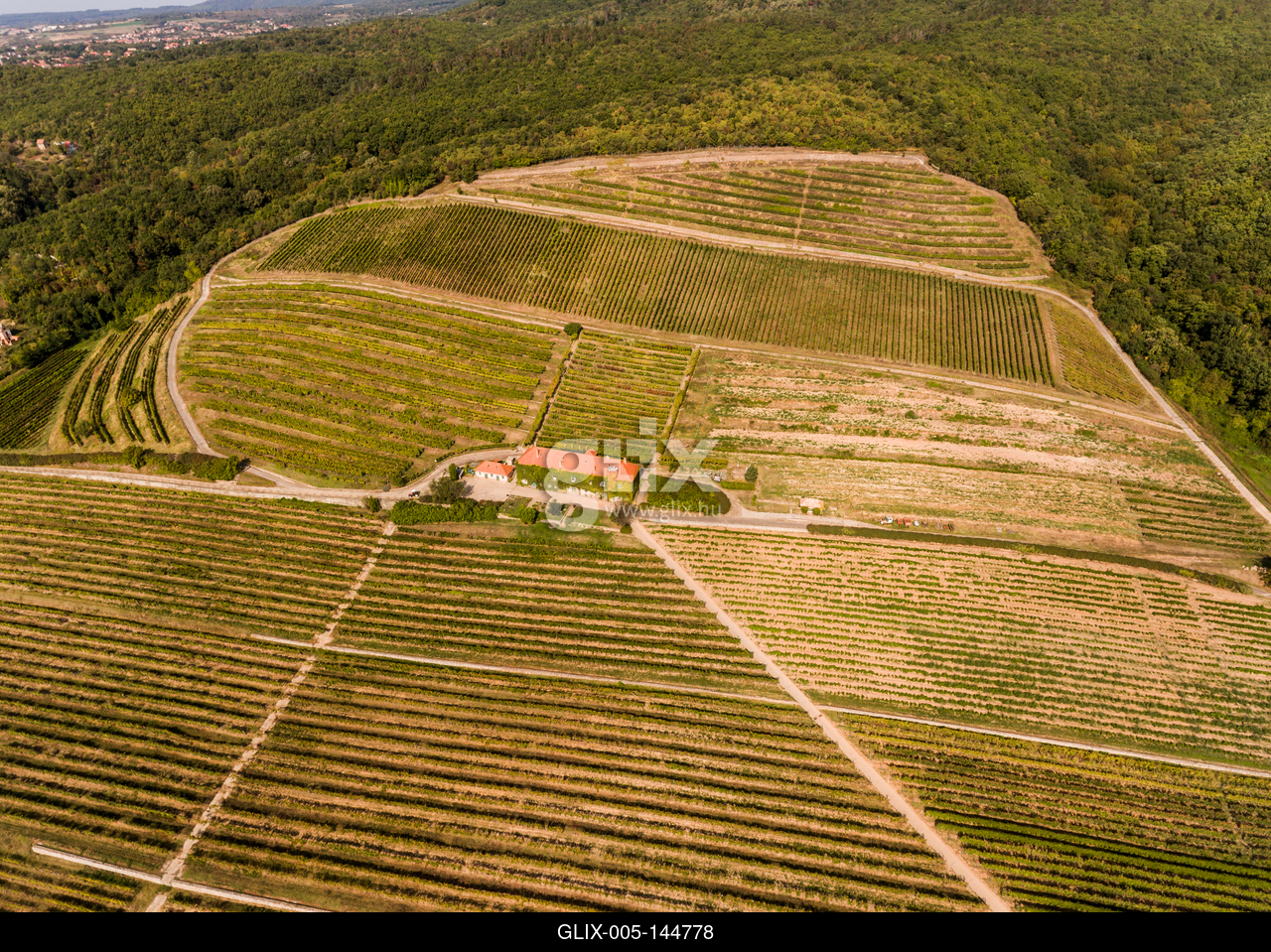 Vineyard from bird eye view with blue sky.A PTE Szőlészeti és Borászati Kutatóintézet Szentmiklóshegyi Kísérleti Telepe madártávlatból.A Pécsi borvidék egészen Mohácsig tart, a Mecsek déli lejtőin folyik szőlőművelés.