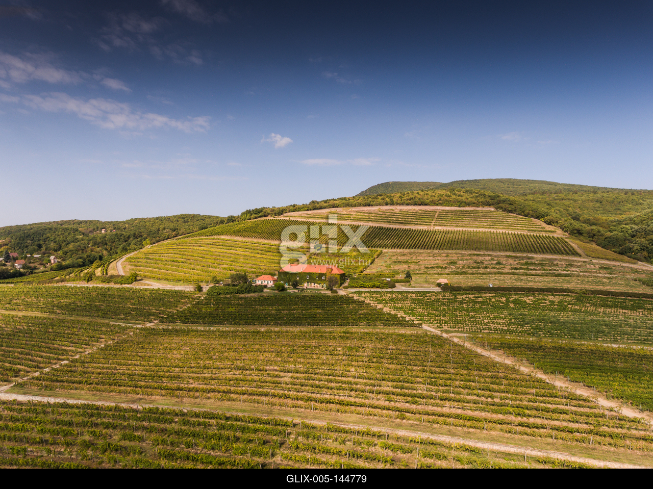 Vineyard from bird eye view with blue sky.A PTE Szőlészeti és Borászati Kutatóintézet Szentmiklóshegyi Kísérleti Telepe madártávlatból.A Pécsi borvidék egészen Mohácsig tart, a Mecsek déli lejtőin folyik szőlőművelés.