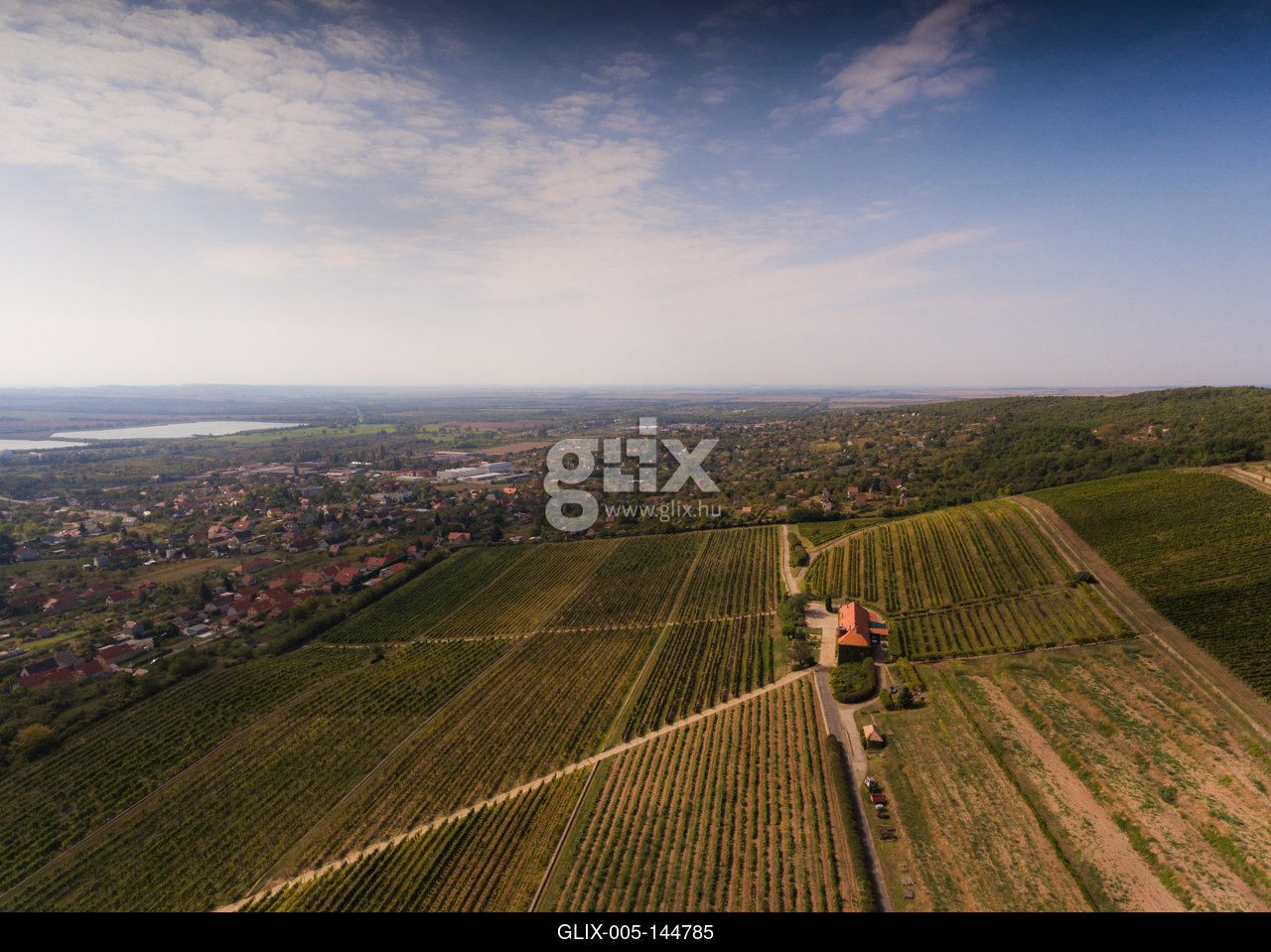 Vineyard from bird eye view with blue sky.A PTE Szőlészeti és Borászati Kutatóintézet Szentmiklóshegyi Kísérleti Telepe madártávlatból.A Pécsi borvidék egészen Mohácsig tart, a Mecsek déli lejtőin folyik szőlőművelés.
