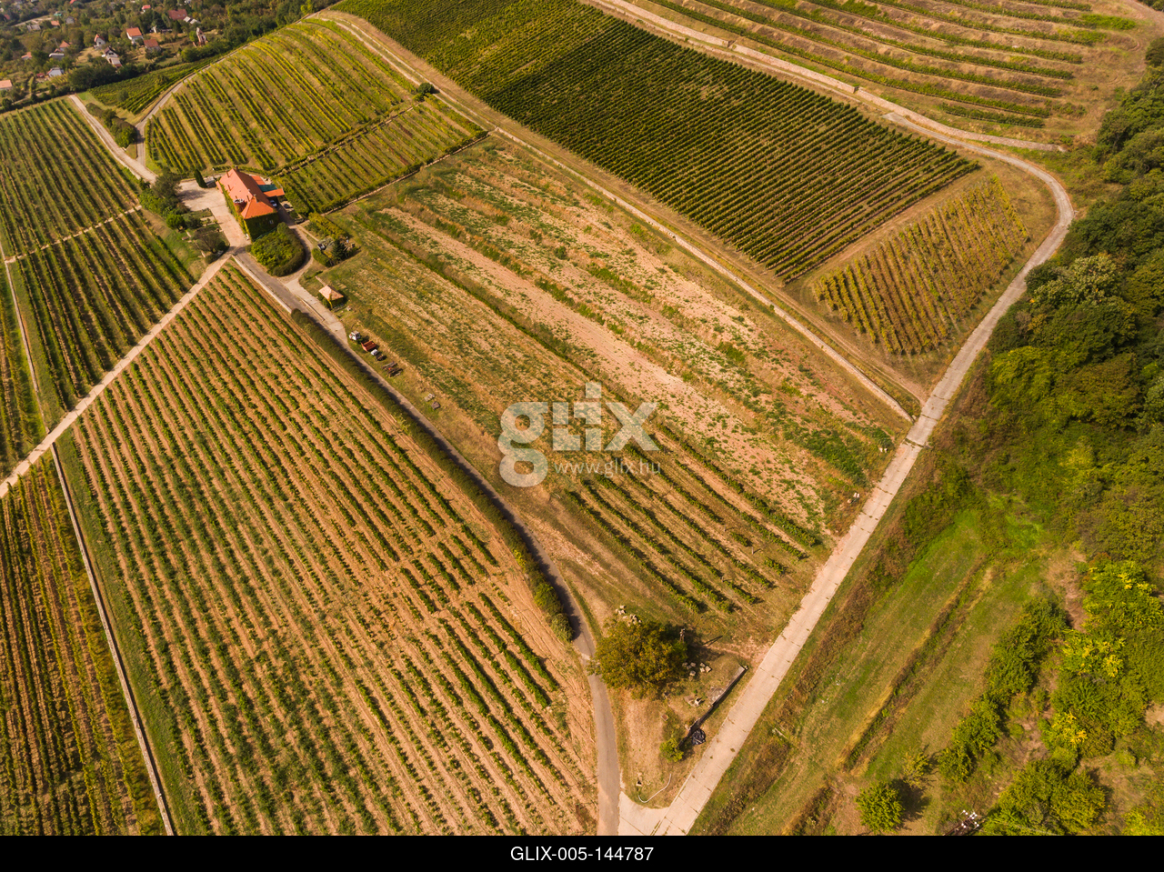 Vineyard from bird eye view with blue sky.A PTE Szőlészeti és Borászati Kutatóintézet Szentmiklóshegyi Kísérleti Telepe madártávlatból.A Pécsi borvidék egészen Mohácsig tart, a Mecsek déli lejtőin folyik szőlőművelés.
