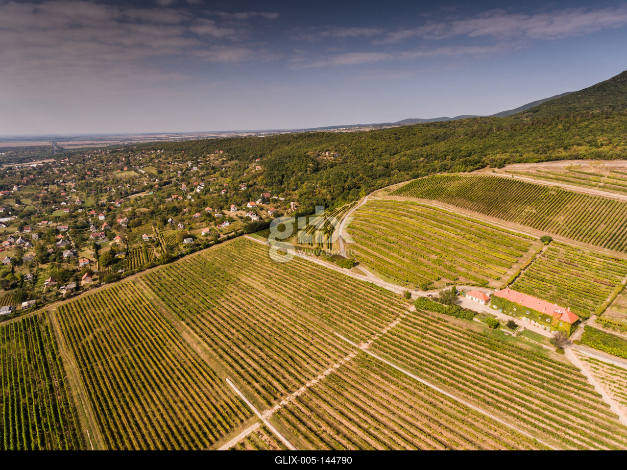 Vineyard from bird eye view with blue sky.A PTE Szőlészeti és Borászati Kutatóintézet Szentmiklóshegyi Kísérleti Telepe madártávlatból.A Pécsi borvidék egészen Mohácsig tart, a Mecsek déli lejtőin folyik szőlőművelés.