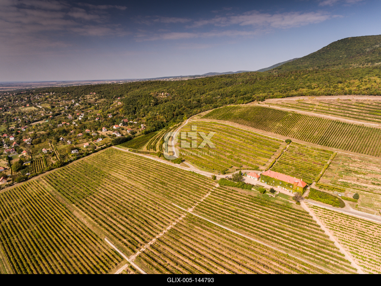 Vineyard from bird eye view with blue sky.A PTE Szőlészeti és Borászati Kutatóintézet Szentmiklóshegyi Kísérleti Telepe madártávlatból.A Pécsi borvidék egészen Mohácsig tart, a Mecsek déli lejtőin folyik szőlőművelés.
