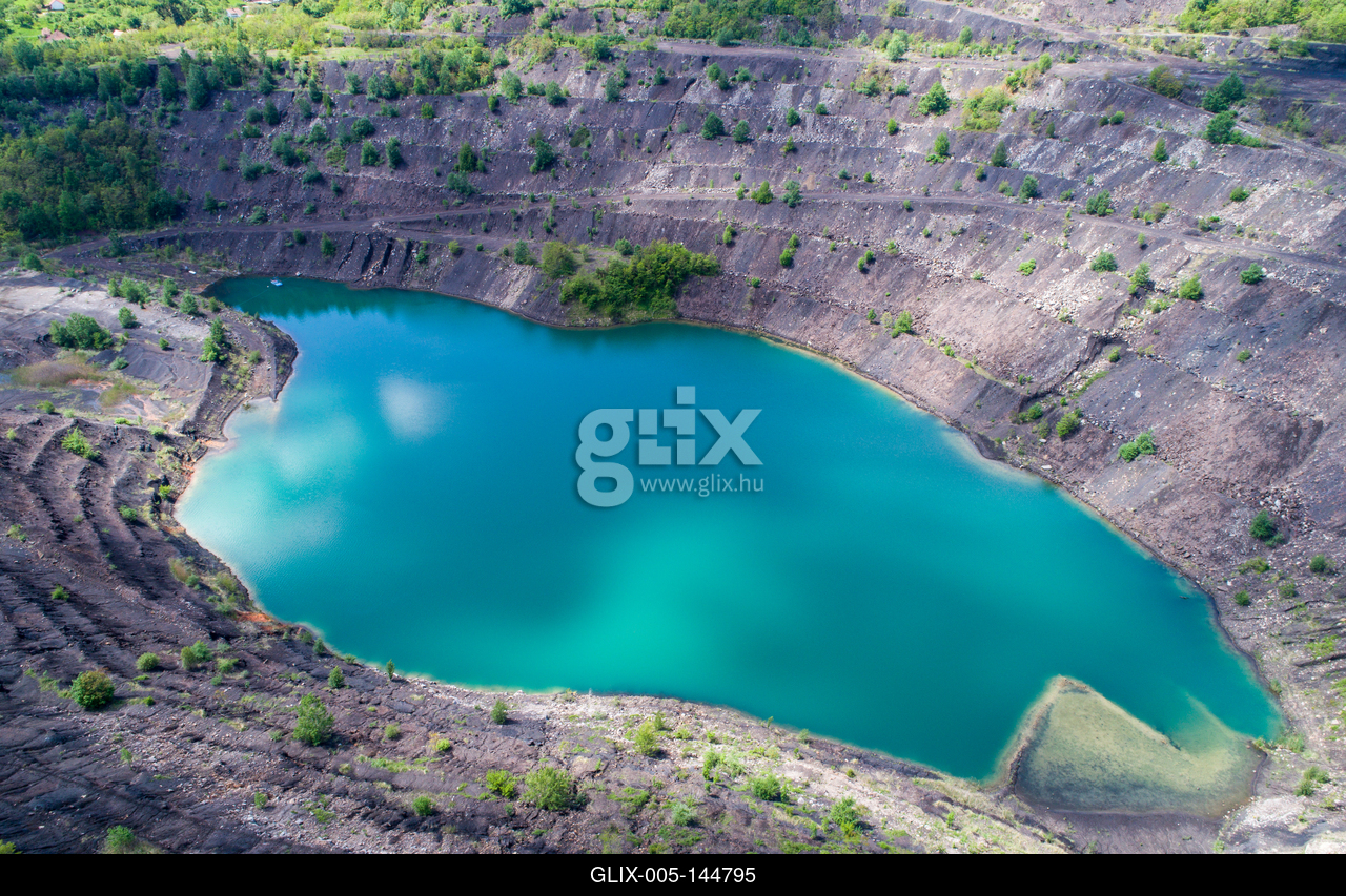 A Karolina-külfejtés és bányató látképe madártávlatból. A pécsbányai Karolina-külfejtésben 2004-ig folytattak bányászati tevékenységet.Aerial view, deep mine lake in place of a mining pit