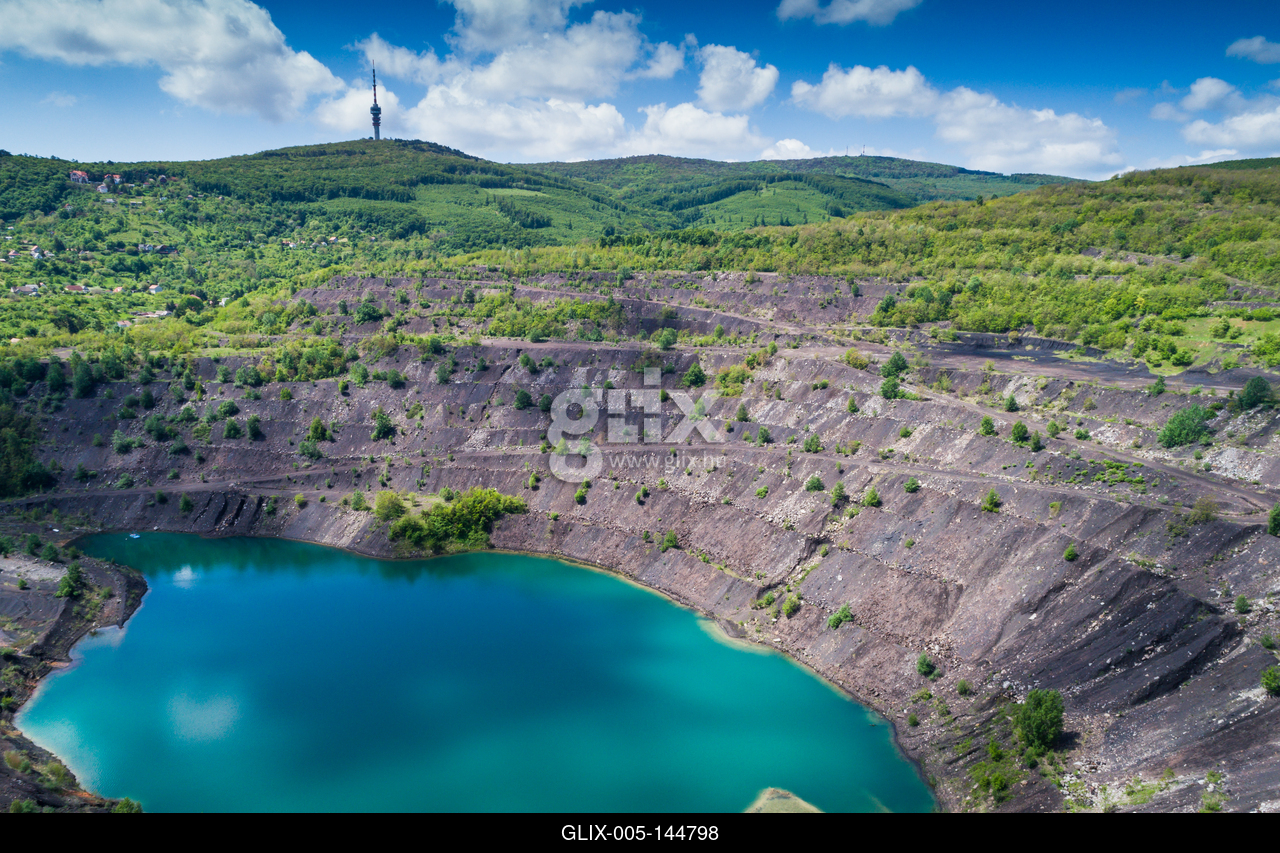A Karolina-külfejtés és bányató látképe madártávlatból, háttérben a Mecsek csúcsai, a Misina tető a TV toronnyal. A pécsbányai Karolina-külfejtésben 2004-ig folytattak bányászati tevékenységet.Aerial view, deep mine lake in place of a mining pit