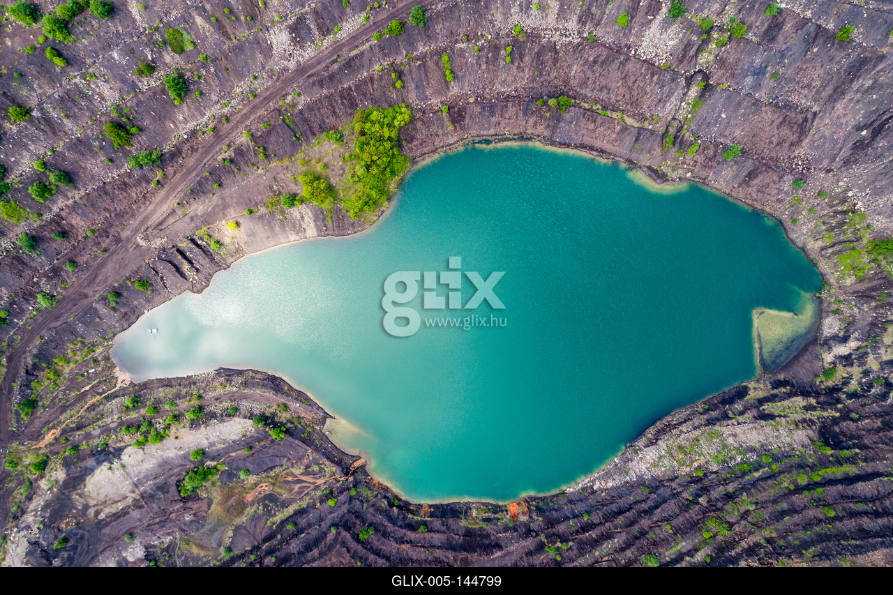 A Karolina-külfejtés és bányató látképe madártávlatból. A pécsbányai Karolina-külfejtésben 2004-ig folytattak bányászati tevékenységet.Aerial view, deep mine lake in place of a mining pit