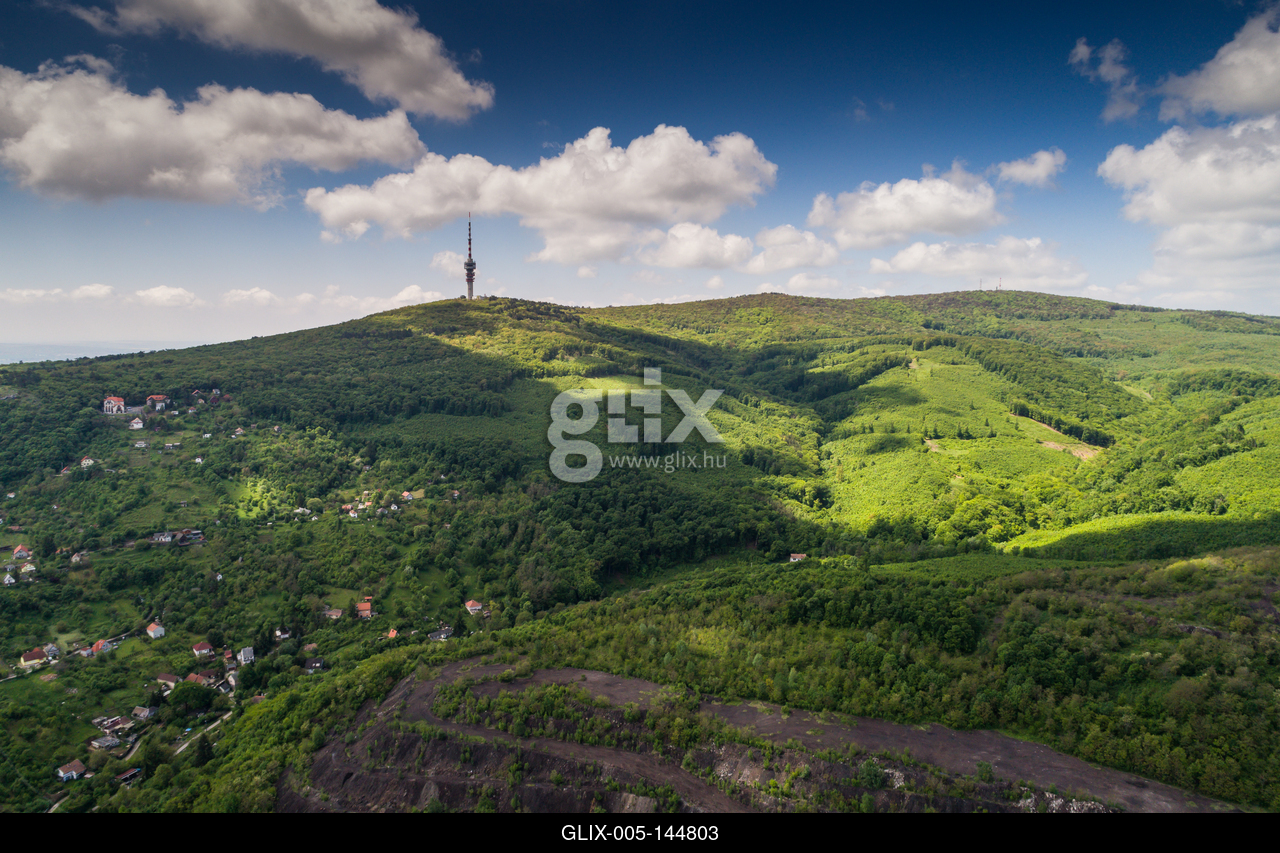 A Karolina-külfejtés és bányató látképe madártávlatból, háttérben a Mecsek csúcsai, a Misina tető a TV toronnyal. A pécsbányai Karolina-külfejtésben 2004-ig folytattak bányászati tevékenységet.Aerial view, deep mine lake in place of a mining pit